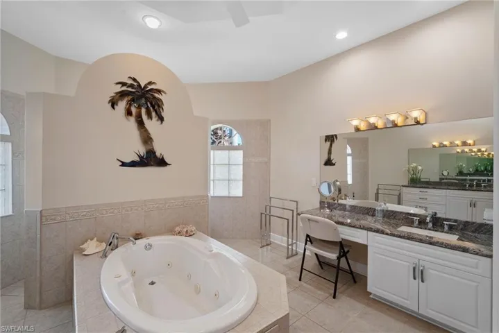 A new roof, solar panels, gutters and pool cage were installed in 2023. The interior features a bright open-concept floor plan with a well appointed kitchen, granite countertops, and stainless steel appliances, ideal for both everyday living and entertaining. The primary suite offers dual sinks, a walk-through shower and soaking tub. Additional features include manabloc plumbing and a central vacuum system.