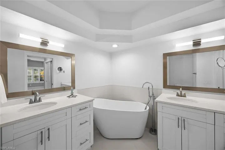 One or more photo(s) has been virtually staged, AI generated or rendered. Perfectly positioned on a quiet interior street within the gated community of Calusa Bay in North Naples, this reimagined lakefront, end-unit coach home offers privacy, walkability, and a true lock-and-leave lifestyle. One of the few residences with an attached two-car garage, it is ideal for seasonal or full-time living. Completely renovated and move-in ready, the home features elegant tile flooring throughout, sleek ceiling fans and lighting, and updated interior doors and hardware for a clean, modern coastal feel. The open living area flows to a large screened lanai with electric storm shutters, overlooking peaceful lake and water-feature views. Calusa Bay is pet friendly, allowing up to two small dogs, and the home offers abundant interior storage, unusual for a condominium. As an end unit, additional windows enhance natural light and privacy. Residents enjoy a clubhouse, pool with lap lanes and spa, sundeck and pier, fitness center, two lighted Har-Tru tennis courts, on-site management, and an active social calendar. With two gated entrances and close proximity to beaches, shopping, dining, cultural venues, and excellent schools, this home offers effortless Naples living.