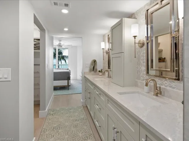 POSITIONED ON THE GULF OF AMERICA SHORES, THIS STUNNING RESIDENCE BOASTS AMAZING WATER VIEWS, WARM GULF BREEZES, AND PICTURESQUE SUNSETS. THIS LUXURY CONDOMINIUM HAS BEEN COMPLETELY OPENED UP AND RE BUILT TO PERFECTION, FEATURING A REIMAGINED FLOOR PLAN. THE L SHAPED KITCHEN IS A CHEF’S DREAM, EQUIPPED WITH STATE OF THE ART CULINARY APPLIANCES, COFFEE BAR, HAND CRAFTED CABINETRY, AND MODERN STYLISH QUARTZ COUNTERS WITH MATCHING BACKSPLASH. THE ENTRY TO THE PRIMARY SUITE HAS BEEN REPOSITIONED, PROVIDING AMPLE SPACE FOR THE SUITE ITSELF AND A HOTEL INSPIRED LUXURY BATH, WHICH INCLUDES AN ENORMOUS SHOWER WITH IMPORTED TILE, AND A VANITY ATOP CUSTOM CABINETS. WITH THIS PROFESSIONAL REDESIGN, THE LIVING SPACE FEELS MUCH LARGER AND IS COMPLEMENTED BY DESIGNER FURNISHINGS AND DECOR, OFFERING AN INSTANT LIFESTYLE FOR THE FORTUNATE RESIDENT. THE COZY GUEST SUITE LOCATED AT THE FRONT OF THE CONDOMINIUM FEATURES A LUXURY BATHROOM AND DESIGNER FURNISHINGS. ADDITIONALLY THE HOME HAS IMPACT GLASS AND SHUTTERS MAKING THIS YOUR SAFE HARBOR IN A STORM. EVERYTHING IN THIS CONDOMINIUM IS BRAND NEW AND PRISTINE, READY FOR YOU TO MOVE IN AND ENJOY THE BEAUTIFUL SURROUNDINGS. THIS IS TRULY THE BEST OF THE BEST!
