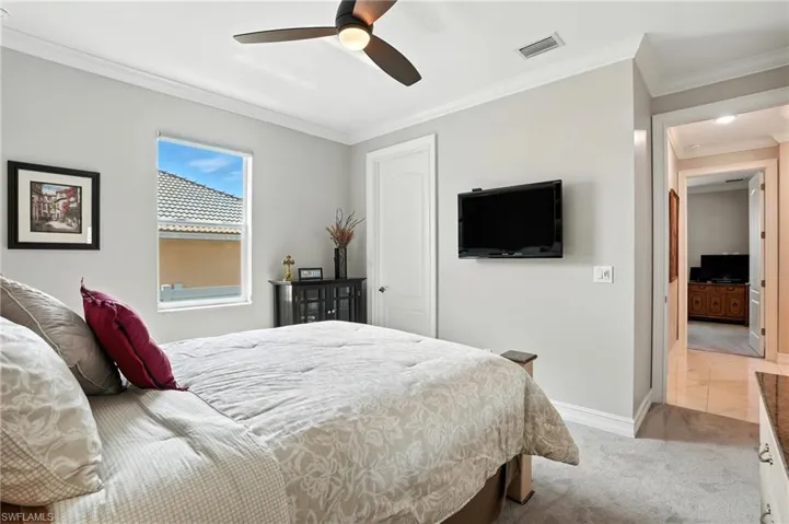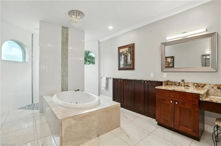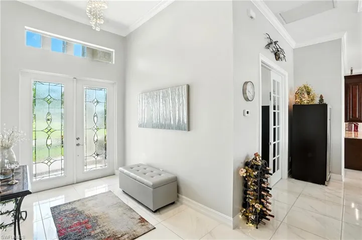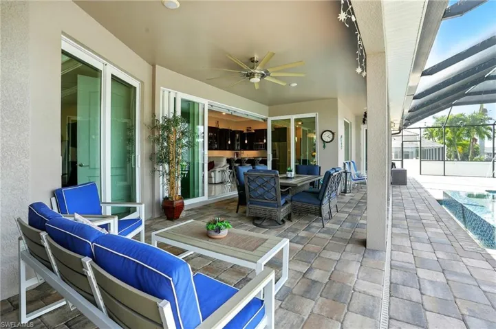 Throughout the home, details impress—crown molding, 8-foot solid core doors, soaring 14-foot coffered ceilings with LED lighting, and impact windows and doors. Expansive 8-foot pocketing sliders seamlessly blend indoor and outdoor living, enhanced by electric remote-control shades for privacy and comfort.