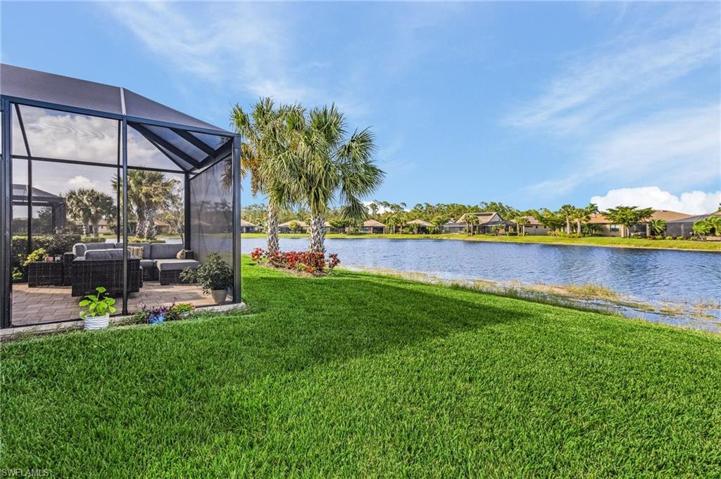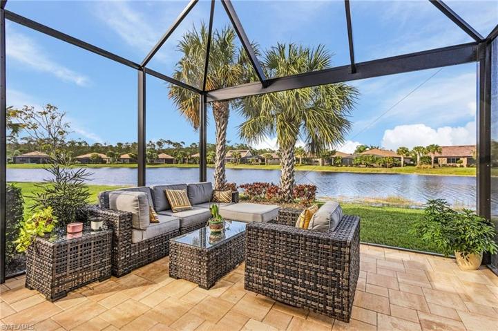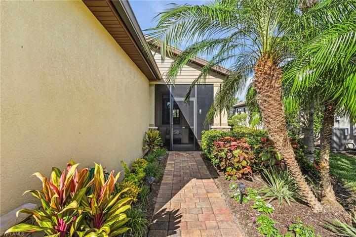 Price Drastically Reduced!! This gorgeous home with stunning lake views is in the lovely, gated community of Bridgetown. It is 2BR/2BA + Flex Room/Office and is bright and very well-maintained. Walk up the paver driveway next to the beautiful landscaping to the newly screened enclosed, paver porch. Entering the glass door find tile throughout. The large flex room has new French doors and a Calif Closet Murphy bed with storage, can use as a 3rd bedroom. The updated, amazing chef’s kitchen with a 7 1/2 foot center island has quartz countertops, raised paneled cabinets with a mosaic glass backsplash, stainless steel whirlpool appliances, huge pantry, disposal and under sink reverse osmosis system! The bedrooms are spacious with plenty of closet space and the primary has a coffered ceiling. The primary bath has a large walk-in shower, with new rain shower head and a seamless glass shower door and tile surround, dual sinks with cultured marble countertops. The sunroom can be used for a private dining room or sunny sitting area. The expanded, screened lanai is a true paradise retreat with new pavers and a picture frame window screen for viewing the birds and wildlife on the lake. Updates Include: Ceiling fans, water heater with circulation pump, recessed can kitchen lights. Nearby amenities: pickleball, tennis, bocce ball, 2 pools, gym, weekly events. Welcome Home!