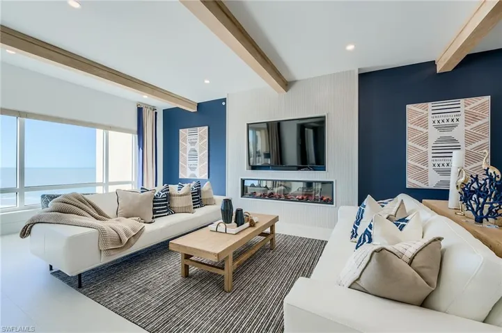 An exceptional expression of classic coastal luxury with a modern sensibility, this beachfront residence at Madeira Condominiums offers a rare combination of architectural refinement, inspired interior design, and an irreplaceable position on Marco Island’s most celebrated crescent beach. Completely reconstructed from the studs through an extensive $1M renovation, the residence has been re-envisioned with uncompromising standards and a sophisticated design approach that feels both timeless and current. Every detail—materials, finishes, lighting, and millwork—was selected to elevate the home beyond typical condominium living, creating an environment that is polished, intentional, and quietly impressive. Set directly on the sugar-sand beach of Marco Island, next to the JW Mariott, the residence enjoys sweeping Gulf views and prized western exposure, allowing you to capture stunning sunsets across the living spaces and beachfront lanai. More than 3,500 square feet of interior space provides a gracious scale rarely found in coastal condominiums, with three bedrooms, three and one-half baths, and a layout that blends openness with well-defined private retreats. A private elevator entry opens to interiors distinguished by architectural detailing, custom millwork, coffered ceilings, and a carefully curated palette that complements the coastal setting. The kitchen is a refined focal point—equipped with premium appliances including a gas cooktop and double wall ovens, seamless custom cabinetry, and substantial solid-surface countertops—designed to serve both daily living and elegant entertaining with ease. The primary suite offers a serene and spacious retreat, complete with a sitting area overlooking the Gulf and pool views as well as the JW Mariott beach. A beautifully finished bath featuring high-end materials and fixtures compliments the primary, with all bedrooms ensuite offering your family and guests a refined experience. A generous covered lanai extends the living space outdoors with all bedrooms accessing balconies, offering a comfortable vantage point for beachfront living, evening sunsets, and entertaining against an open-water backdrop. Offered turnkey furnished, the residence allows for immediate enjoyment of Madeira’s full-service lifestyle, including a private theater, secure elevator lobbies, fitness center, guest suites, clubroom with bar and billiards, tennis and pickleball courts, beachfront pool and spa, outdoor grilling areas, two under-building garage parking spaces, private storage, and 24-hour gated security. Ideally located adjacent to the JW Marriott and the entertainment, dining and shops on Collier Blvd. This remarkable home is one with design integrity, beachfront presence, and a level of finish best appreciated in person—this is the epitome of Marco Island luxury, thoughtfully executed.