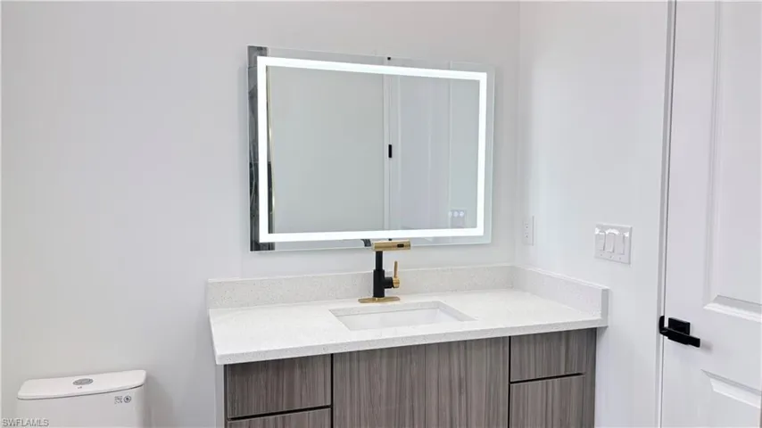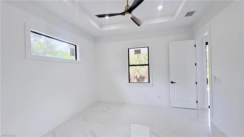 This 2026 New Construction Home sits proudly on a .50-acre oversized lot, offering the perfect blend of space, elegance, and functionality. From the striking metal impact double entry doors to the paver driveway and walkway, every detail is crafted to impress. Modern light fixtures, ceiling fans in every room, and a sleek contemporary fireplace. The gourmet kitchen features a white quartz waterfall island, 42” wood cabinets with crown and light molding, stainless steel appliances, a cooktop, dual microwave/oven, and a stylish hood. A fully equipped outdoor kitchen extends the living space—perfect for Florida entertaining. High-end finishes shine throughout: 24×48 porcelain tile flooring, 10’ ceilings, 8’ interior doors. The luxurious master suite includes a spacious two walk-in closet, a glass-enclosed shower, and a rainfall, waterfall. Additional features include impact windows and doors, an advanced A/C system with individual room returns, and a full sprinkler system.