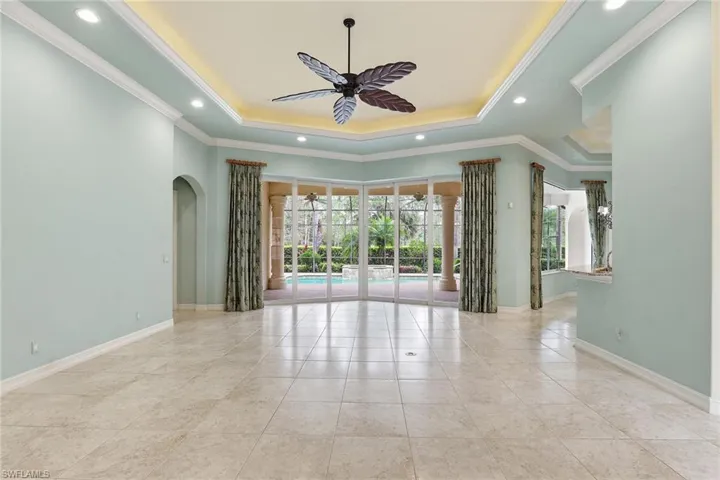 Situated on a 0.27-acre homesite with preserve views, this residence offers 2,904 square feet of living space with three bedrooms plus a den and three full baths. Built in 2003, the property includes a three-car garage and a screened outdoor living area with a pool and spa, providing a private setting. The interior features tile and hardwood flooring, tray ceilings with crown molding and recessed lighting, and an open-concept layout. Expansive sliding glass doors allow natural light and provide access to the lanai. The kitchen includes granite countertops, custom wood cabinetry, a center island and breakfast bar seating, along with a built-in wall oven and full appliance suite. The primary suite offers a spacious layout with an en suite bath and walk-in closets. A formal dining area with tray ceiling detail and arched architectural elements adds to the interior design. Outdoor living includes a screened enclosure with pool and spa, as well as a covered lanai with preserve views. Located in Olde Cypress, a gated community offering golf, tennis, pickleball and bocce courts, a fitness center, community lap pool and a renovated clubhouse. The community is positioned near Naples beaches, as well as shopping and dining destinations.