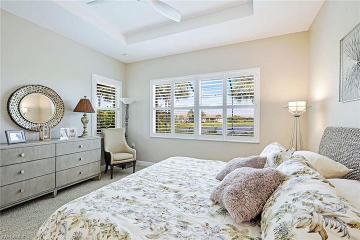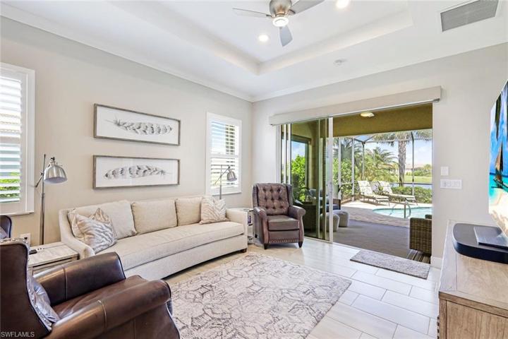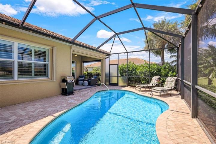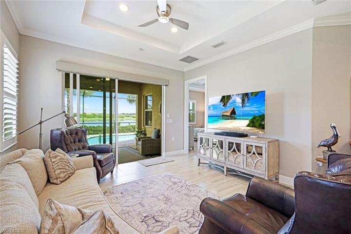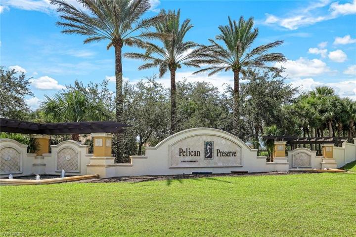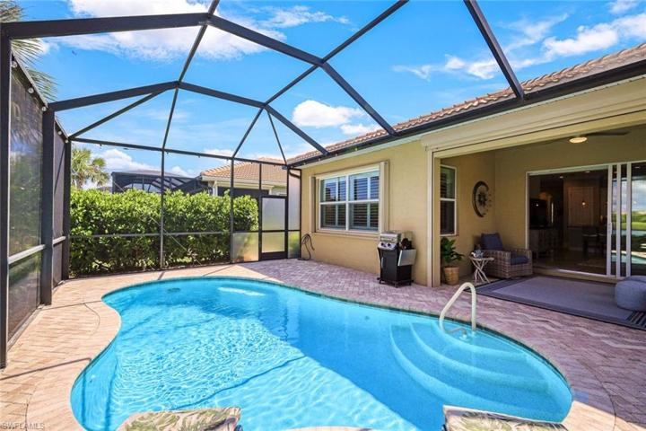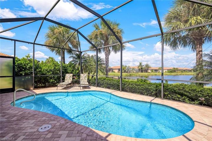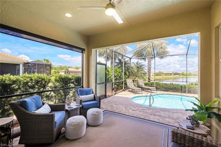 Spacious Medina Floorplan with 3 bedrooms, 2 baths, 2 car garage, Heated Pool and Waterfront homesite built by WCI in this fabulous 55plus Community of Pelican Preserve. Upgrades include plank tile floor and upgraded carpet, full home Storm Smart motorized Roll Down lanai hurricane screens , whole house Aluminum accordion storm shutters, professionally installed lanai string lights with indoor light switch and dimmer. Upgraded cam lights and ceiling fans, upgraded Landscaping, Plantation Blinds, Hunter Douglas motorized roller shades on sliding doors, in wall pest defense system. Great Room floorplan featuring granite counter tops, wood cabinetry, stainless appliances, custom interior painting. The two guest rooms are served by a spacious bath with a shower /tub combo. The Primary bedroom offers a large closet and overlooks pool. The bath offers dual sinks and a walk-in shower. Enjoy a covered lanai for dining and entertaining and grilling and lounging by the heated pool. Amenities include gated entrance, golf, restaurants, indoor and outdoor pools, pickleball, tennis, billiards, art and sewing studio, fitness center, spa, walking trails, Ampitheater events.Close to the airport.