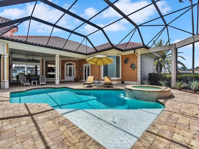 Exquisite courtyard home located in the highly desirable community of Gulf Harbour. This home has it all including GULF and GOLF access complete with a mother-in-law quarters. This home is situated in the Edgewater subdivision overlooking the golf course with a lake view. Be wowed with the outdoor living space right as you enter this home. Complete with in ground pool with sun shelf and spa, outdoor kitchen, and plenty of living space for entertaining. The main home holds 3 bedrooms; the owners suite complete with decorative ceiling, fireplace, golf course view, walk in closet and large master bath with dual vanities and a spacious soaking tub. The kitchen has been updated with granite counter tops, stainless steel appliances, double oven, and center island. Upstairs you will find an additional living space as well as the 2 bedrooms and an updated jack and jill bathroom with dual vanities. The mother in law suite offers spacious living area, kitchenette with stainless steel appliances, updated bathroom, and an in unit washer and dryer. Additional features include updated pool cage, luxury vinyl floors installed in 2021, waterless tank heaters, wireless pool controls, updated lighting, 3 air handlers, central vac system, updated appliances, and an audio/video system.