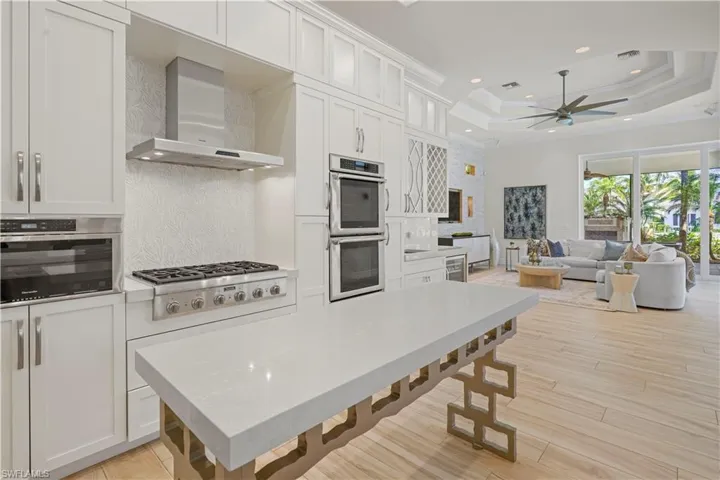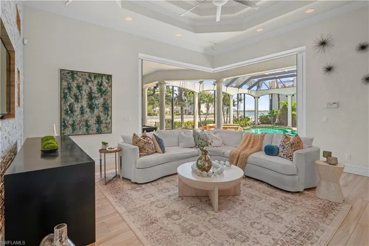Upon entering, you are greeted by sun-filled interiors and breathtaking panoramic views of the tranquil water. The chef’s dream kitchen is a culinary haven, boasting a custom island, a stylish wet bar, and updated appliances that cater to all your entertaining needs. The formal dining room and living room provide an elegant space for gatherings, complete with a beautiful baby grand piano that adds a touch of sophistication.