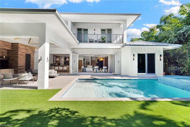 Located near the Gulf of Mexico in the heart of Olde Naples, this single family home offers a blend of elegance, sophistication & coastal charm with timeless appeal. The meticulously designed interior features impeccable craftsmanship & finishes while the open-concept layout provides an airy ambiance filled with natural light. A blend of functionality & aesthetic beauty, the gourmet kitchen boasts top-of-the-line appliances including a Lacanche range & custom cabinetry. Equipped with retractable screens, the covered lanai with summer kitchen offers a seamless transition from indoor to outdoor living and leads to the saltwater pool & spa, enveloped by lush landscaping. Unwind in the comfort of the primary suite, a retreat that exudes tranquility with a spacious ensuite featuring a soaking tub, walk-in shower & dual vanities. Each of the additional four guest bedrooms is thoughtfully designed with its own ensuite bathroom, providing privacy & comfort. In addition, the home is equipped with Lutron lighting, Sonos, climate-controlled garage, and a ChargePoint Home Flex EV charger. A wine room, study, lounge, powder room & pool bath further enhance the functionality & ease of living.