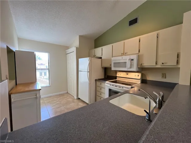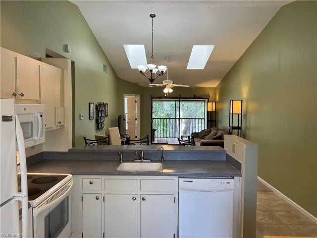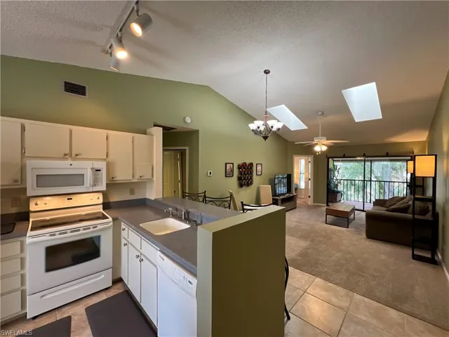 Welcome to this inviting 2-bedroom, 2-bath second-floor condo located in a quiet, well-maintained community in Fort Myers, just minutes from scenic Lakes Park. The open-concept living area features vaulted ceilings and two skylights that fill the space with natural light. The kitchen offers ample cabinet storage, a full appliance suite, and an adjacent breakfast nook or work area.