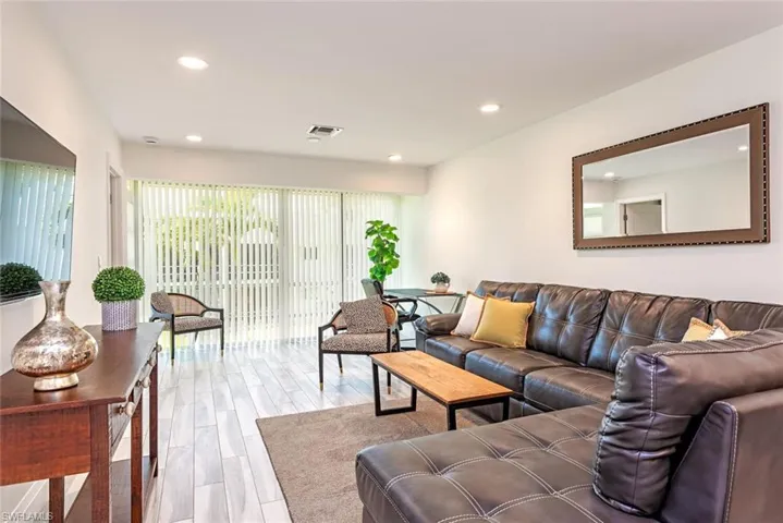 The updated interior includes upgraded appliances, granite countertops in the kitchen and bathrooms, porcelain wood-look flooring, recessed LED lighting, impact hurricane windows, stainless steel appliances, and a full -size in unit washer and dryer.