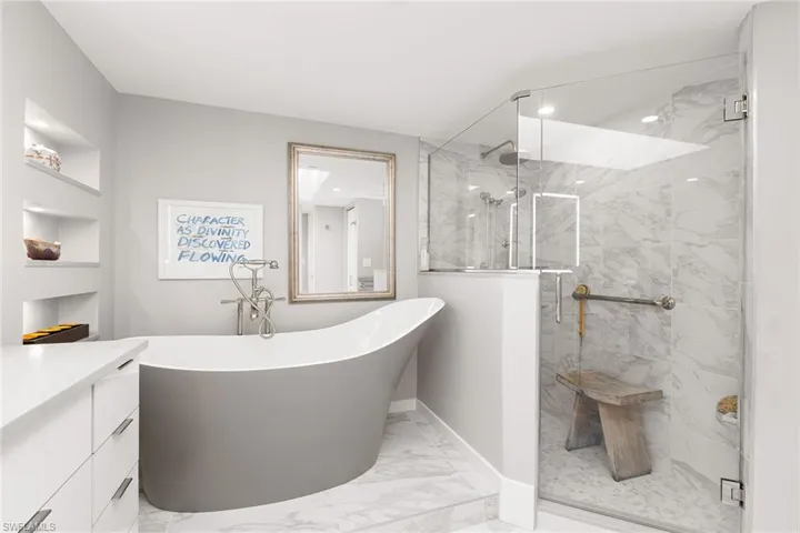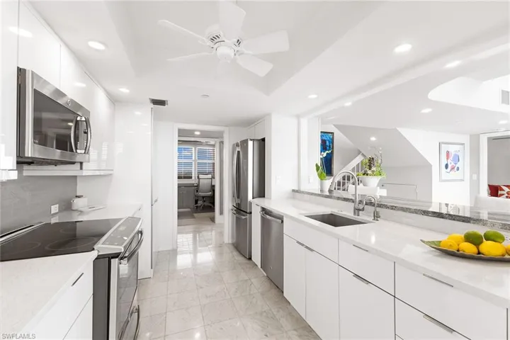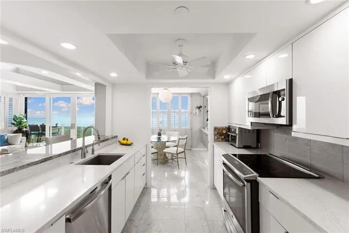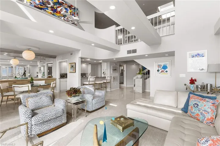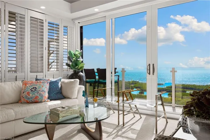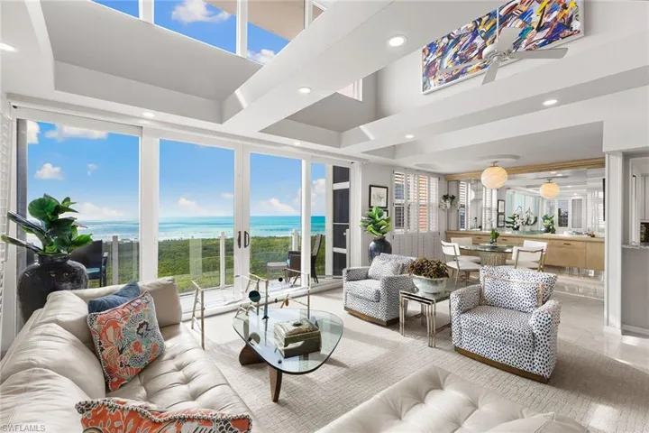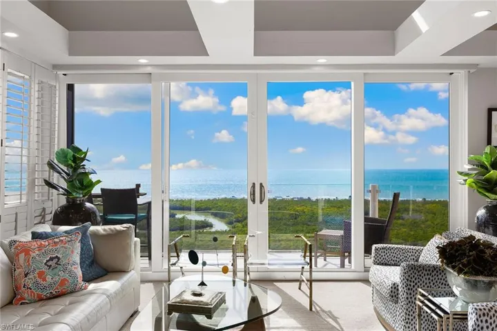 Prepare to be dazzled by the sheer elegance and breathtaking views offered by this two-story penthouse residence perched atop the St. Maarten high-rise in the middle of Pelican Bay. Step onto a private balcony and behold the awe-inspiring vistas of Clam Pass and the majestic Gulf of Mexico. With glass balcony railings providing unobstructed panoramas, every sunset becomes a work of art. This exquisite residence boasts a thoughtfully designed floor plan, with an updated kitchen, living room, home office, family room and beautifully renovated bath on the first floor. Ascend the staircase to discover three bedrooms and two beautifully renovated baths upstairs. St. Maarten offers a lovely social room and kitchen, billiards room, library, fitness, a large pool and spa, guest suites, storage, and is located near the walkway to the beach. Experience the pinnacle of coastal living in Pelican Bay including miles of walking paths, a fitness and wellness center, tennis, and three miles of beachfront with two private restaurants. Near the Ritz Carlton Beach Resort, Naples Grand Resort, upscale Waterside Shops, Artis-Naples, and some of the best restaurants in Naples.
