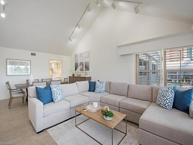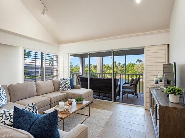 JUST REFRESHED! New paint, countertops, art and accessories! Forever western lake views and soaring ceilings in this 2nd floor 3-bedroom plus den condo WEST of the Blvd in Pelican Bay. Just steps to the private beach tram — even walkable to the beach; and next to the Commons tennis facility and Foundation resources. Two small dogs or cats allowed, 3/30 rental policy. Assigned under cover parking. A tranquil setting in which to enjoy everything that Pelican Bay has to offer.