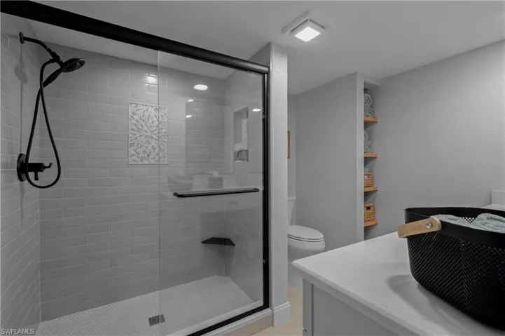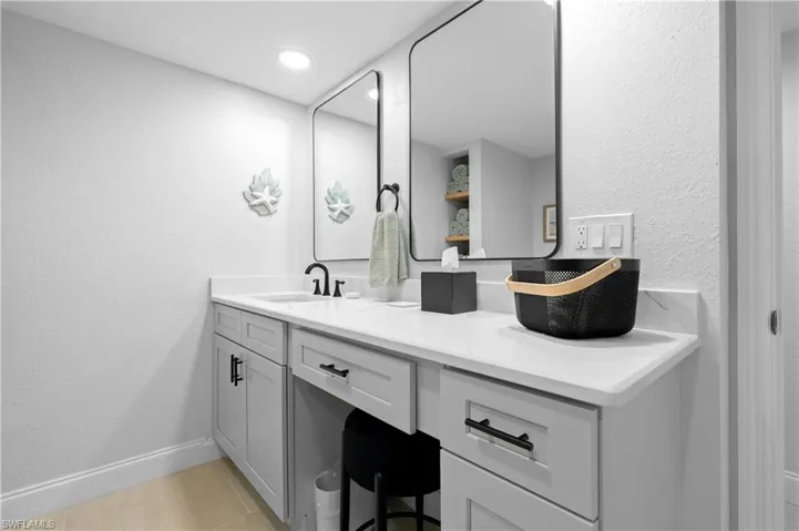 Premium tile flooring flows seamlessly throughout, complementing the spacious living area equipped with contemporary electric blinds on the sliding doors leading to your private lanai. The primary bedroom suite provides a luxurious retreat with two walk-in closets and a stunning en-suite bathroom featuring designer-tiled shower, makeup vanity, and direct lanai access. Positioned on the opposite side of the residence, the guest bedrooms share an exquisitely renovated bathroom with designer tile shower and are secluded behind a pocket door for enhanced privacy.