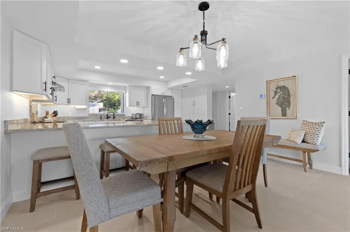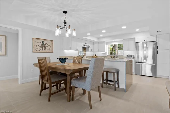 From the moment you cross the threshold, you’ll be captivated by the open floor plan revealing breathtaking vistas of both tranquil waters and manicured golf course fairways. The gourmet kitchen stands as the crown jewel of this home, boasting exotic granite/quartzite waterfall countertops, custom cabinetry, and premium stainless steel appliances—a culinary masterpiece for both everyday living and sophisticated entertaining. The formal dining area offers versatile seating options with the adjacent island counter.