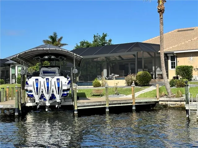 Luxurious Waterfront Living Awaits! Welcome to your dream home! This exquisite 3-bedroom, 3-bathroom residence is a true gem, perfectly nestled along the serene South Spreader Waterway. Location, location, location!! Without bridges, the Cape Harbour marina and restaurants are just a short boat ride away. Enjoy the outdoors year-round featuring a sparkling heated salt water infinity pool and hot tub, perfect for unwinding in style and embark on boating adventures from your new dock equipped with a 16,000 lb boat lift. This home is a boater’s paradise! Inside, every detail has been thoughtfully designed with luxury in mind. Crown molding throughout the home graces the spacious rooms, while stained glass windows and pleated shades add charm and sophistication. Natural light floods the home, creating a warm and inviting atmosphere. The primary bedroom offers a peaceful retreat with its newly tiled shower. For added peace of mind, this home includes a concrete block hurricane/fallout shelter for safety and security. Hobbyists and those in need of extra storage will love the expanded extra deep 2.5 car garage with room for a golf cart and cooled with a new mini split AC unit. New pavers have been installed in the driveway and walkways, adding a fresh, modern touch and enhancing the home’s curb appeal. Additional updates include new pool equipment, new lanai cage, new roof, new tankless hot water heater, and a new refrigerator. Additional Features include closet organizers for optimized storage, alarm system for enhanced security, whole-home sound system for entertainment, 7,500-watt generator with transfer switch and power cord. This waterfront paradise truly offers the perfect blend of luxury, comfort, and tranquility. Don’t miss your chance to own this stunning home — schedule your private showing today and experience waterfront living at its finest!