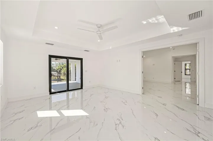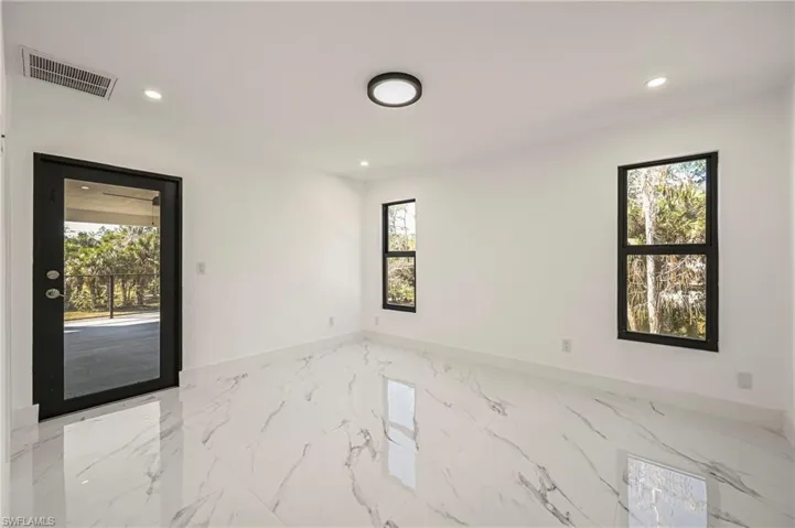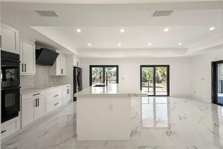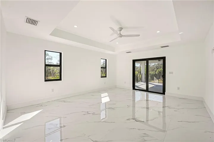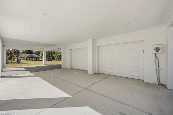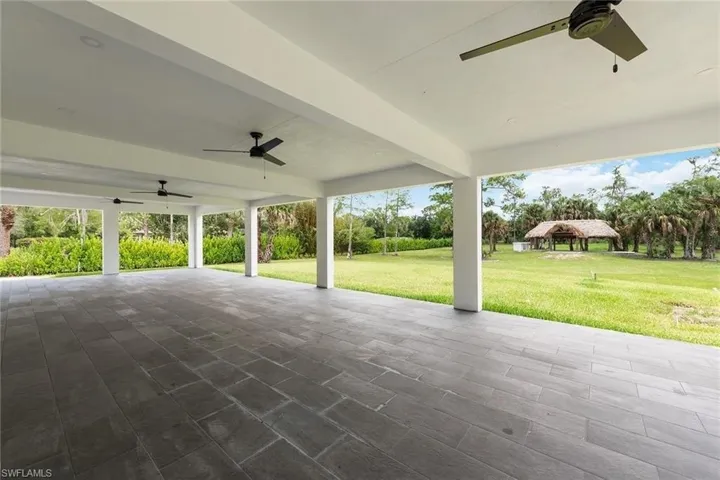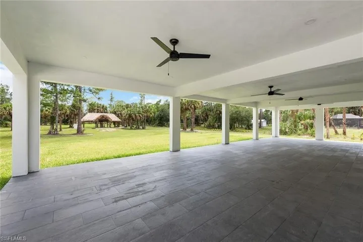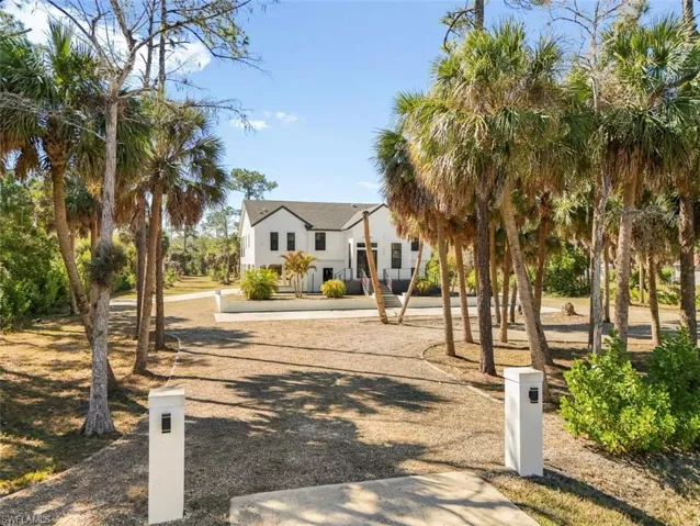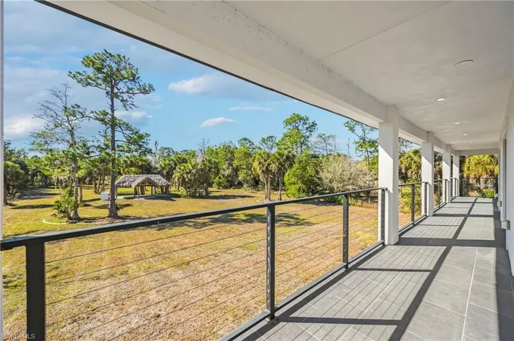 Discover your private retreat in the heart of Golden Gate Estates, featuring 2.14 acres of upland property within a sprawling 2.50-acre parcel — offering the perfect foundation to build, expand, and create your own tropical oasis. Here, serene privacy meets refined Florida living, with ample space to add a custom pool, guesthouse, workshop, or private mother-in-law suite. This new construction, never-lived-in two-story residence seamlessly blends modern luxury with the tranquility of expansive acreage. Boasting approximately 2,970 total square feet, the home showcases soaring volume and tray ceilings, elegant high-end finishes, impact-resistant windows and doors, tile flooring throughout, a new roof, new septic system, and a new hot water heater — delivering the peace of mind and energy efficiency today’s buyers expect from new construction. The open-concept design effortlessly connects the living, dining, and kitchen areas, creating an inviting space ideal for entertaining. At the heart of the home, the chef’s kitchen features a striking marble island with additional storage, custom white cabinetry, brand-new appliances, an electric cooktop, and generous prep space. Expansive sliding glass doors frame picturesque views of the lush grounds, flooding the interiors with natural light and enhancing the bright, airy ambiance. The primary suite serves as a private sanctuary, complete with balcony access overlooking the charming tiki bar, a spacious walk-in closet, and a beautifully appointed spa-inspired bath featuring dual vanities and an oversized walk-in shower with rainfall shower heads. Two additional bedrooms offer comfort, privacy, and ample closet space for family or guests. A wrap-around second-story balcony captures peaceful views of the surrounding landscape, while the expansive tiled lower level presents an exceptional opportunity — enclosing the first-floor space, including the garage area, could create approximately 3,000 additional square feet of living space. The fully finished lower-level garage already includes plumbing and tile work for a future bathroom, making it ideal for conversion into a private guest suite, home gym, or multigenerational living quarters. Outdoors, a concrete entertaining area and traditional tiki hut set the scene for unforgettable gatherings, perfectly embracing the relaxed elegance of Southwest Florida living — all within a brand-new estate designed for comfort, flexibility, and long-term value.