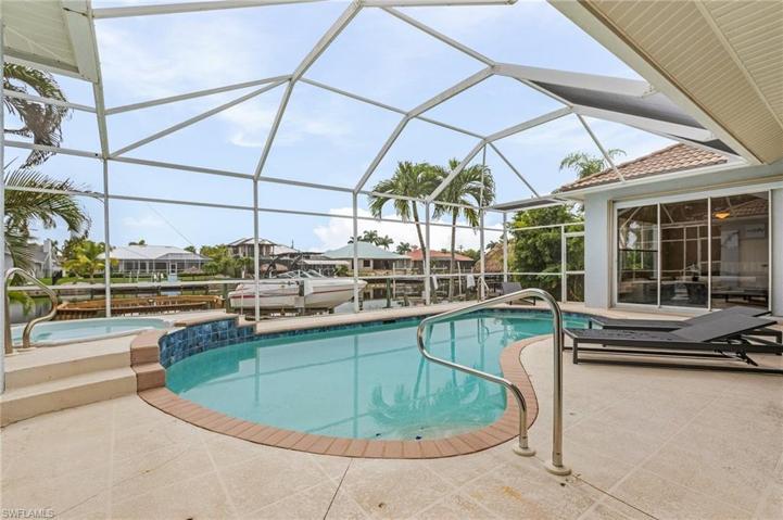 Spectacular canal views in amazing location close to Cape Harbour with great access to shopping, dining and boating. Home features an open floorplan and high ceilings in living room opening up to the pool area with completely retractable sliding glass doors. The custom kitchen with double oven, new family hub fridge with tv screen and kitchen island with breakfast seating area is overlooking the bright living room and the formal dining area. A modern master suite with a bright full bath, two queen bedrooms and an extra family room that is currently used as another bedroom completes the house. The concrete driveway leads to the oversized 2 car garage which features 3 extra storage rooms with one of these being airconditioned. The pool with built-in spa is just perfect to enjoy our incredible Florida weather and if you ever get cold there is a sauna next to the pool to heat you up. Captains walk, sundeck, wrap around wood decking and 2 boat lifts complete this waterfront paradise. Priced to sell! Please don’t wait to make this dream home yours.