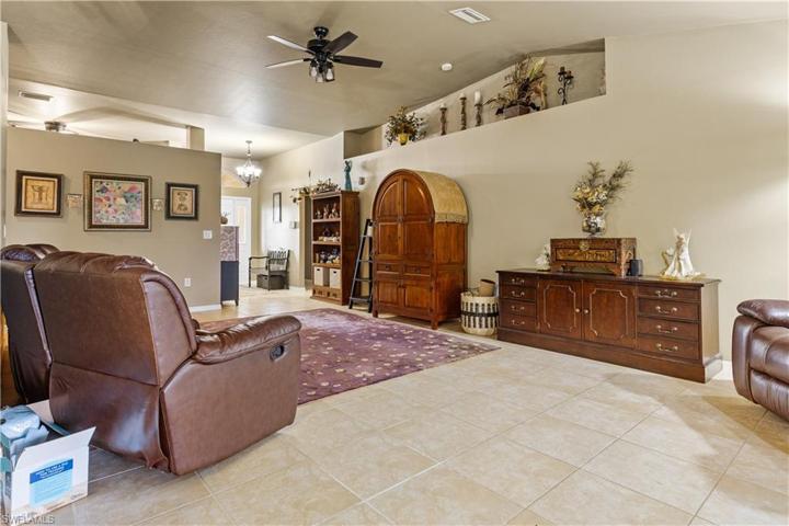 Indulge in the spacious allure of this impressive 4-bedroom + office/den, 2-bath residence situated in NE Cape Coral. NO FLOOD INSURANCE NEEDED! Beautiful home featuring exquisite tile flooring throughout its expansive design. Host gatherings seamlessly in the roomy great room, complemented by a well-equipped kitchen boasting ample cabinet space, SS appliances, pantry & breakfast bar. You’ll love the generously sized breakfast room/dining area—a true gathering spot for family & friends. Unwind in the master retreat with walk-in closet, double sinks, a soothing soaking tub & separate shower. The well-thought-out floor plan situates the ample guest rooms on opposite side, ensuring privacy & comfort. Versatility is showcased with the inclusion of a sizable office- could also den or formal dining room. Recent upgrades include new roof in 2023, AC system (2018) & new well equipment in 2023. Centrally located, this home is close to Pine Island Corridor and Route 41, offering convenience to shopping, dining, and swift access to Fort Myers. Embrace the opportunity to have everything you need just minutes away—welcome to a lifestyle of comfort and accessibility!