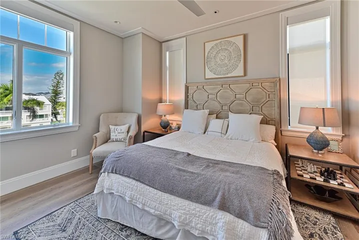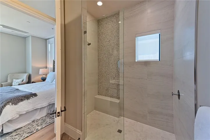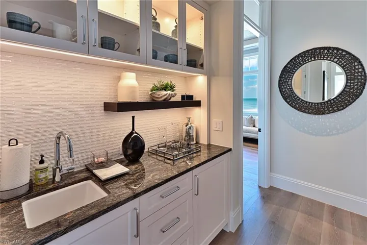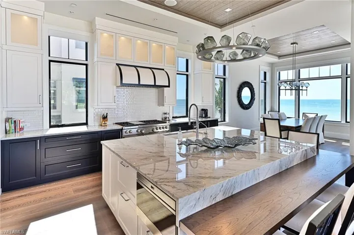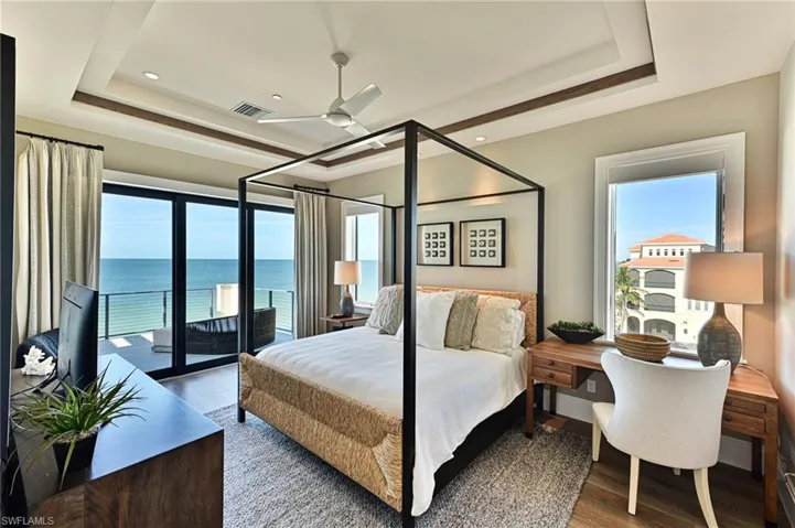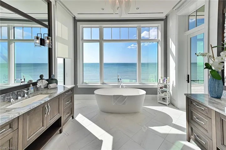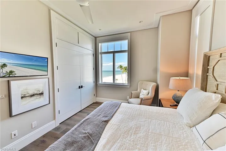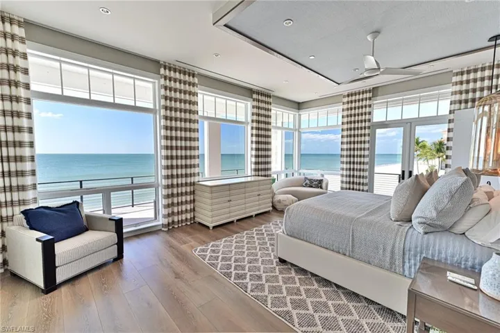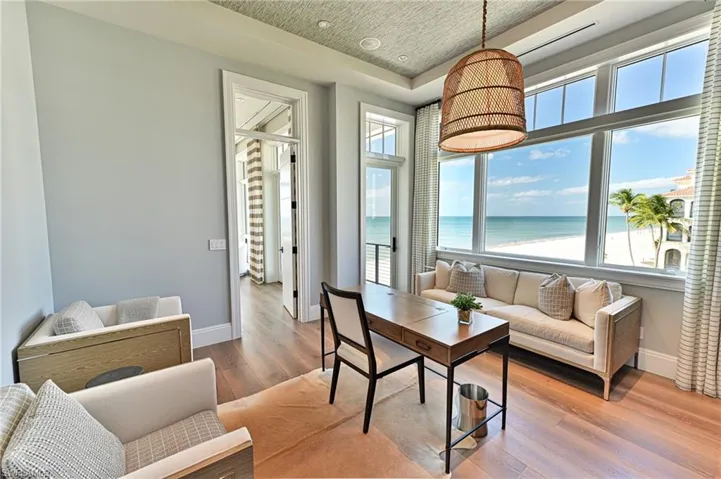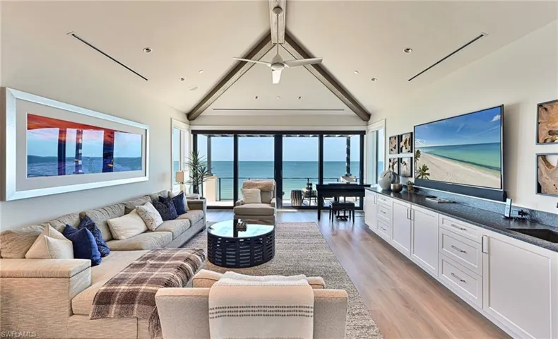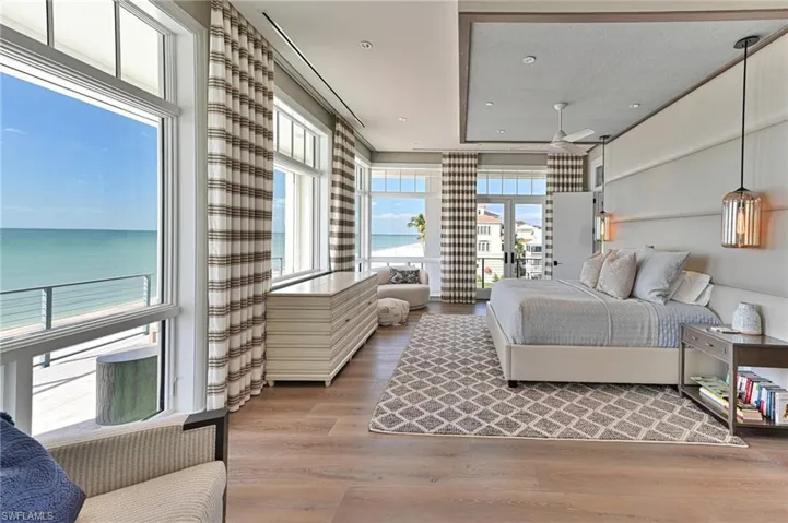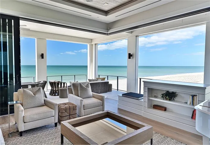This 4 story Barefoot Beach Front Home offers Gulf views and sunsets that will take your breath away from every floor and every room. The timeless coastal contemporary design, detailed care and maintenance of this home makes it feel as if it was just completed. The 5,782 AC SQ FT provides for a spacious open floor plan, Grand living areas, generous room sizes, 5 bedrooms + den, 7-baths including a second cloud living area. The 9,472 total living SQ FT provides for amazing outdoor living areas, summer kitchen, open decks, pergola deck with gas fire bowl all right on the beach plus a car collector size garage. The value of this beachfront site cannot be understated as there will never be a home built close to this home on the beachfront where it is 218 feet to the next beachfront home to its north and 30 feet to the south, whereas the normal side setbacks between homes in Collier County and Naples are just 7.5 feet. Add to that there are no public beach access points within the Barefoot Beach community you have one of the most private beach settings imaginable. Windover Development, Kukk Architecture, Potter Homes and Freesyle Interiors, all first class, brought their best to create this amazing home. Offered turnkey furnished so you can move right in and enjoy this season. The main level chef’s kitchen includes Wolf/Sub-Zero appliances, quartzite countertops, custom wood cabinets & classic white oak hardwood floors and opens to the dining room, great room & outside lanai via 10’ electric sliding glass doors plus guest bedroom 2 w/ensuite bath & a half bath. The master bedroom, bath and private lanai are spread across the whole width of the home where you feel like you are floating on the Gulf from your bed or the freestanding tub. The office/den has private access from the master bedroom and bedroom 3 w/ensuite bath & laundry complete the 3rd level. The top floor offers a large cloud living room with detailed vaulted ceilings and guest bedrooms 4 & 5 both w/ensuite baths plus an open deck with fire bowl. Amenities inc Crestron home automation, private elevator, detailed millwork including ceilings, designer plumbing & light fixtures, concrete construction, Andersen impact windows, motorized screens, storm shutters & sliders, plus aluminum snap-clad metal roof system. Barefoot Beach, Collier County’s premier gated beach to bay community, amenities include 24 hour guards and patrols, Clubhouse with fitness, tennis, pickleball full time on site Manager, beach garden pool and more. Option to join the Club at Barefoot Beach WITH NO WAIT (located in the community) which offers casual & fine dining restaurants, pool & beachside food, drinks, chair service, indoor & outdoor bars, ice cream & coffee shop, tennis courts with pro & a full events calendar. Minutes to Mercato, Coconut Point Mall, Promenade & Waterside, the airports and golfing. Boat docks are available for lease or purchase right across the street.
