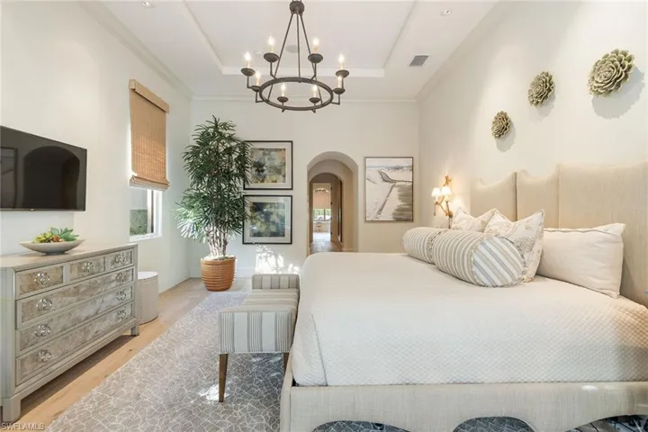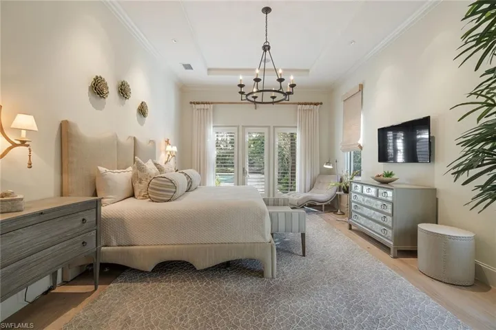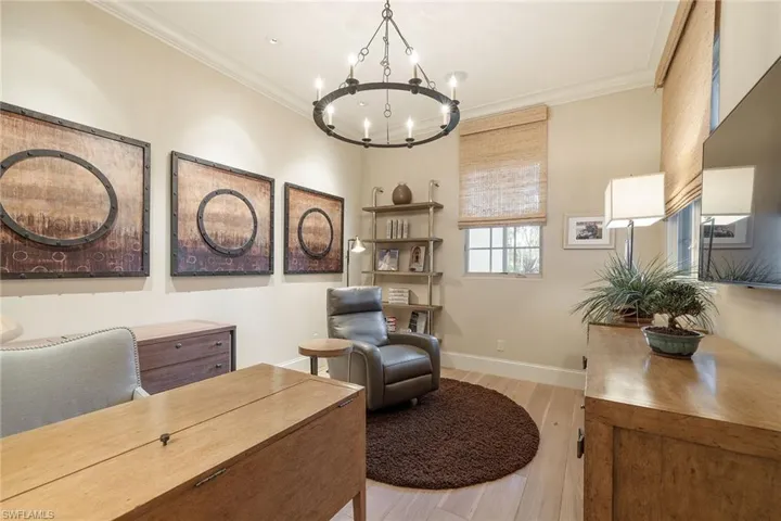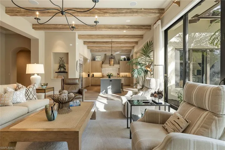 IMMEDIATE GOLF MEMBERSHIP OPPORTUNITY AVAILABLE. Offering three ensuite bedrooms and a private den, this sunlit home in the heart of desirable neighborhood of Cortile in Mediterra. Take advantage of this homesite that will allow for a future fourth bedroom! Your day starts with coffee in the kitchen nook, surrounded by panoramic views from floor-to-ceiling sliding glass doors that seem to bring the lush landscape right inside. These doors, effortlessly sliding open, transform your living space into a seamless blend of indoor and outdoor luxury, a hallmark of Naples relaxed lifestyle. As you move through the spacious great room, you can’t help but notice how natural light plays off the beamed ceilings that also embellish the dining room and kitchen areas, highlighting the warmth of the rich wooden floors beneath your feet. Outside, the expansive covered patio awaits with stained wood ceiling details, ready to host the day’s gathering with ample space for laughter, stories and Florida sunshine. The professional-grade kitchen, outfitted with top-tier appliances, makes entertaining easy and enjoyable. Additional features include whole- house generator Generac, water sensor system, remote-controlled screens, shutters and shades, impact windows and doors including 10-foot sliding doors, Sub-Zero, Wolf and Bosch appliances, Wood Mode Cabinetry, air-conditioned garage and more. In the award-winning community of Mediterra featuring two Tom Fazio championship golf courses, gel pickleball courts, Har-Tru tennis, state-of-the-art fitness and a private beach club. Enjoy convenience of your toes in the sand and golden sunsets at Mediterra’s fully renovated private beach club along the Gulf. Imagine arriving having your car valet parked, and lounge chairs and umbrellas waiting for your arrival or set up upon request. With 10,000 square feet of space, the upper level offers indoor and alfresco dining, a full bar, swimming pool along with lockers and dressing areas for changing. Spend the day and enjoy dinner while watching the sunset in the distance. Discover Mediterra where you can have it all!