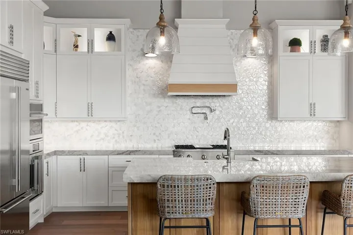 Why wait years to build when this exquisite 2023-built residence awaits? Offering 3,539 square feet of air-conditioned living space, this home features three bedrooms, each with walk-in closets and private baths, plus an additional one and a half baths. Refined details include engineered wood flooring with a natural, aged finish and Brilliant Smart Home automation for seamless control of lighting, music, and communication. The chef’s kitchen features GE Monogram appliances, including a gas stove, wine and beverage center, Sub-Zero refrigerator, and a walk-in pantry for convenient storage. Motorized blinds add a modern touch to all bedrooms and the private office, which enjoys serene water views. Perfect for entertaining, the home offers in-ceiling Sonos speakers, ceiling fans, and an expansive outdoor area. The 1,709-square-foot pool deck includes a sun shelf, fountains, hot tub, gas fire pit, outdoor shower, and a lanai with motorized screens for comfort and privacy. The fully equipped outdoor kitchen includes a grill, sink, refrigerator, and ice machine. Additional highlights include a 3-car garage with epoxy floors, a circular driveway, a 24 kW whole-house generator, two AC units, and a 500-gallon propane tank. The fenced side yard is ideal for pets, and the dock pilings are ready for a customized dock, with electric and water connections already installed. Positioned for breathtaking west-facing sunsets, this home also offers a front-row seat to the annual Christmas parade and peace of mind with no flooding from recent hurricanes.