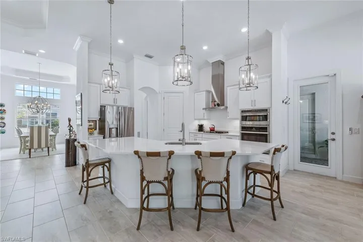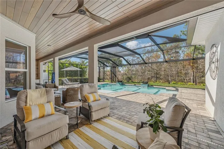 Stunning golf course home with immediate full golf membership and western views of #14 at Tiburon/Ritz-Carlton Golf Resort. On an oversized lot in the gated Sereno Grove community with breathtaking western views of the renowned Black Course of the Tiburon/Ritz-Carlton Golf Resort, this immaculate three-bedroom plus den, three-bath home offers luxury living at its finest. In one of Naples most sought-after golf communities, this like-new, pristine one-story residence features high-end finishes, open-concept living spaces and an abundance of natural light. The spacious floor plan includes an open kitchen with premium appliances, elegant living and dining areas with 18-foot ceilings and a primary suite with expansive golf course views. Enjoy sunset vistas with seamless indoor-to-outdoor living thanks to an oversized lanai with huge pool and summer kitchen, ideal for entertaining or relaxing. Natural gas powers the cooktop, grill, pool and spa and the whole-house generator. Additional highlights include a three-car garage, wonderful storage space and meticulously landscaped grounds on an oversized lot. Whether you are a golf enthusiast or simply seeking a serene retreat, this property offers the ultimate in luxury and convenience. Experience resort-style living at the Tiburon Golf Club including 36 holes of championship golf, clubhouse with concierge service, fitness center, spa and Ritz resort pool with lazy river. Immediate full golf privileges are available with optional membership to the Ritz-Carlton Golf Resort Hotel and the Tiburon Golf Club, as well as the private shuttle to the beach with access to chairs, umbrellas and towels via beach concierge.