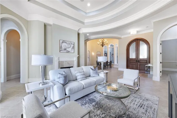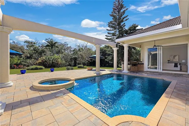 Welcome to your exquisite West Bay estate on one of the most desirable, oversized lots in the community. Your outdoor space is like no other. Relax every day on your extended patio alongside your sparkling pool and spa. Features include a completely fenced in yard, protected preserve view, grill, outdoor refrigerator, and a gas fire pit just to name a few. As you head inside to your luxurious kitchen, you will fall in love with the quartz countertops, huge center island and wraparound bar, luxurious stainless steel appliances, gas stove, walk in panty, and a delightful wet bar with a wine cooler. To top it off, this residence has towering ceilings in the main living areas, impact-resistant doors and windows, surround-sound throughout, a built-in fireplace, a generous three-car garage with epoxy flooring and much more. Experience the unparalleled amenities at West Bay Club including the new beach club on the Gulf of Mexico, the gorgeous clubhouse, resort-style pool, poolside Aqua Café and bar, remodeled fitness center, tennis, pickleball, bocce, River Park with a boat launch and more! Social and golf memberships are separate but not mandatory.