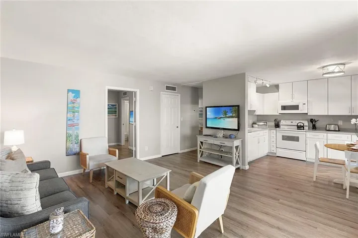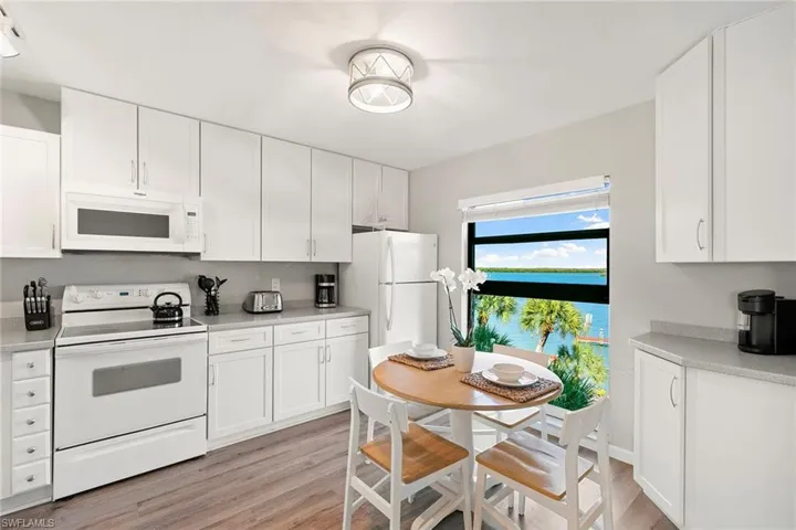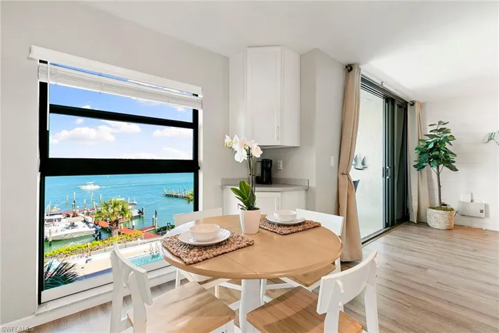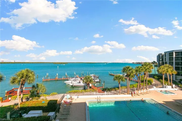 Welcome to Riverside C406, a furnished fourth-floor, one-bedroom, one-bath waterfront condominium on the Marco River with wide-water views from a private screened lanai. Enjoy a front-row perspective of river activity, Pelican Pier Marina, the Jolly Bridge and sunrise views over the pool. The residence offers 800 square feet under air, is nicely maintained, and features luxury vinyl plank flooring plus a bright eat-in kitchen with white cabinetry and a clean-lined, coastal look. Daily rentals are allowed, creating exceptional flexibility for personal use and investment, and the condominium has a strong rental history. Fees include electricity, water, cable with premium channels and internet, along with community amenities. Riverside Club is home to Pelican Pier Marina and offers two pools, a clubhouse, tennis and pickleball courts, a fishing dock and a boat launch. Boat slips are available on a first-come, first-served basis for $400 per year per slip, plus gated, locked boat trailer storage on property. In the heart of Old Marco, close to waterfront dining, outdoor dining, live music venues, shopping and island boating, with nearby bike and boat rentals and local favorites for happy hour. Go onto the lanai, take in the river view and you will understand how easily this becomes your Marco routine.