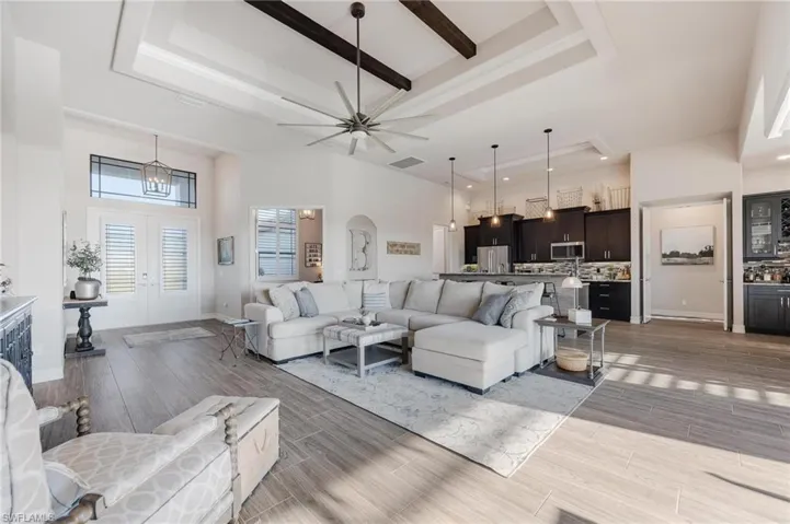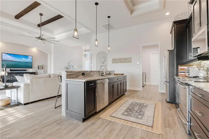 Exceptional value for this 2019 stunning custom built home that exudes the Florida waterfront lifestyle to the tee! This attractive home encompasses 2336 sqft of luxurious interior living space with 3 bedrooms plus an office/den,3 bathrooms & 3 car garage. As soon as you enter the home you are wowed by a 14ft coffered ceiling enhanced with beams & mldg in the great room as well as the 90 degrees impact glass sliding doors that provide spectacular indoor/outdoor space. Interior features include; gorgeous kitchen with huge island, staggered cabinets & pendant lighting, plantation shutters, handy bar area off the dining room, tons of technology; smart lighting, whole house Wi-Fi with 3 access points, full house security system with cameras. The outdoor space is just as stunning; large lanai with outdoor kitchen, cypress wood ceiling, surround sound with ceiling speaks & poolside speakers, dive into the heated saltwater pool with bubbling sun shelf & then take a stroll down via the paver walkway to the awesome composite dock with captains walk, TIKI hut, newer/2023 8k boat lift and boat canopy .Other upgrades include ;whole house gas powered generator , low E energy shield impact window and doors throughout, whole house r/o system with also runs to the dock and enables spot free rinse for your boat . Don’t wait – this home will be sure to check all the boxes and offers attention to detail that you will not find in many homes ! Come and see it today !