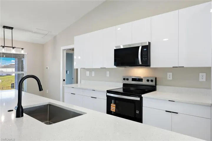 Nueva y hermosa casa de 4 habitaciones y 3 baños FRENTE AL AGUA, construida en bloques de hormigón, en la codiciada zona noroeste de Cape Coral. El vendedor está dispuesto a contribuir a los gastos de cierre del comprador. Vea el recorrido virtual. ¡NO SE ENCUENTRA EN ZONA INUNDABLE! Este popular modelo Verona incluye VENTANAS Y PUERTAS RESISENTES A HURACANES (no se necesitan contraventanas), una amplia y luminosa sala de estar de concepto abierto con pisos de baldosas, techos altos y puertas corredizas de 3 paneles que permiten la entrada de abundante luz natural y ofrecen vistas al agua. La luminosa cocina de chef cuenta con una enorme isla, gabinetes modernos con cierre suave, encimeras de cuarzo y un acogedor rincón para desayunar. La espaciosa habitación principal tiene un luminoso baño privado con encimeras de cuarzo, lavabos dobles, una ducha de azulejos y puerta de vidrio, y vestidor walk-in. Una segunda habitación principal opcional cuenta con un baño moderno y luminoso y acceso directo a la espaciosa terraza. Dos dormitorios adicionales y un tercer baño ofrecen mucho espacio para niños, invitados, una sala de estar, un espacio flexible o una oficina en casa. Ubicada junto a un canal navegable, disfrute de un día de pesca o simplemente explore los canales en paddleboard o kayak. En un vecindario IDEAL PARA FAMILIAS, con fácil acceso a áreas para ir de compras, comer, divertirse y a poca distancia en auto de las famosas playas de arena blanca de Florida. ¡Programe su visita hoy mismo! ~~~~~~~ Brand new, beautiful WATERFRONT 4 bedroom/3 bath concrete block home in desirable NW Cape Coral. NO FLOOD ZONE! This popular Verona model features HURRICANE-RATED windows and doors (no shutters needed), a large and bright open-concept living space with tile floors throughout, soaring cathedral ceiling and 3-panel sliding doors for natural light and VIEWS TO THE WATER. The bright chef’s kitchen features a huge island, modern cabinetry, Quartz countertops, stainless steel appliances, and relaxing breakfast nook. The large owner’s bedroom has a bright ensuite bath with Quartz counter tops, dual sinks, a tiled step-in shower with glass door enclosure, and walk-in closet. An optional SECOND OWNER’S SUITE has a bright, modern bathroom and direct access to the spacious lanai. Two more bedrooms and a third bathroom provide lots of room for kids, guests, a den, a flex space or a home office. Situated on a navigable canal, enjoy a day of fishing or simply exploring the waterways via paddleboard or kayak. In a family-friendly neighborhood with convenient access to areas for shopping, dining, entertainment, and Florida’s famous white-sand beaches. Schedule your showing today!