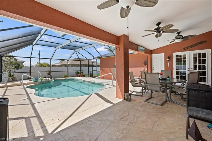 Your new home awaits in NW Cape Coral! This immaculate pool home is well-appointed and features over 2,100 sq ft under air, 4 bedrooms and 2 bathrooms. The upgrades and improvements of this home will give you peace of mind for years to come, and include a new shingle roof (March 2023), impact windows and a whole-house Reverse Osmosis system. The fully fenced backyard is a true oasis, where you’ll enjoy relaxing in the spa, lounging poolside and entertaining outdoors in the expansive and screened lanai. You’ll see how spacious and versatile the floor plan is the moment you step inside, with a split bedroom layout that is highlighted by tile flooring and vaulted ceilings. The eat-in kitchen is the crown jewel at the heart of the home, and is highlighted by quartz countertops, upgraded pendant lighting, cabinet crown molding, stainless steel appliances and an island. The primary bedroom has lanai access through French patio doors, tray ceiling, and an en-suite bath with dual sinks, jetted tub and walk-in shower. A formal living room with lighted tray ceiling, dining room, three guest bedrooms (one perfect for a craft/hobby room or home office) and a pool bath complete the floor plan. Additional features of this home include irrigation, epoxy floor in the garage, roll-down lanai shade, screened front entry, and beautiful landscaping. Don’t miss out on this wonderful opportunity. See it today!