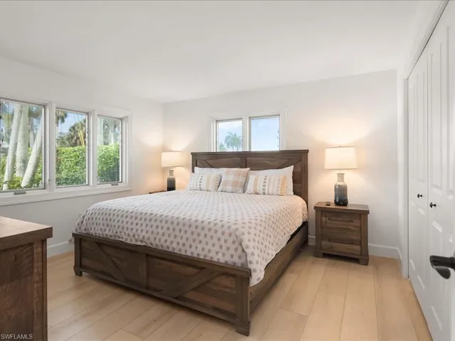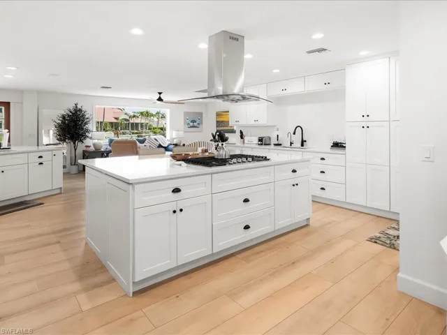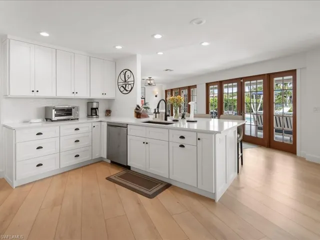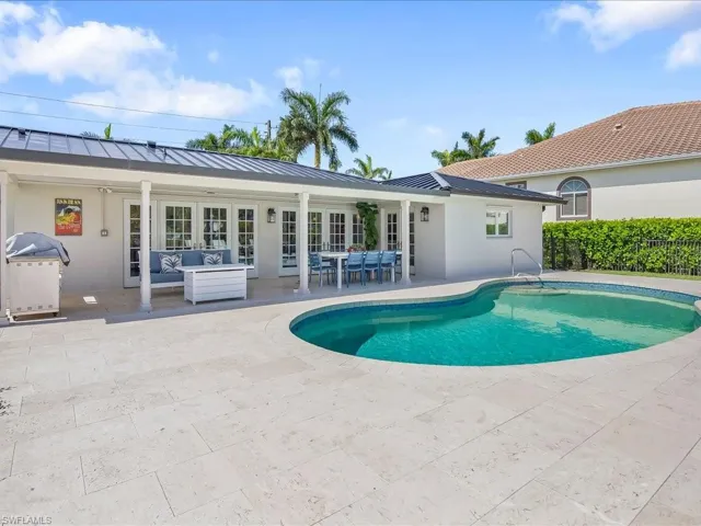 In the coveted “Nifty Fifty” enclave of The Moorings—an intimate stretch of just fifty waterfront homesites where ownership is often held for generations—this fully reimagined coastal residence captures the essence of Naples yachting life with direct, no-bridge Gulf access through Doctors Pass. From the moment you enter, wide-plank wood flooring introduces a sense of understated refinement, guiding you into interiors designed for both relaxed living and effortless entertaining. The kitchen serves as the home’s centerpiece, thoughtfully appointed with quartz surfaces, a gas cooktop beneath a custom-crafted hood, wall oven, microwave, wine refrigeration, and dual sinks. Generous island and bar seating create a natural gathering space, flowing seamlessly into the family room where an expansive picture window frames tranquil canal views and passing vessels en route to open water. A formal dining room set behind French doors offers an elegant setting enhanced by natural light and coastal breezes, while a separate living room provides a more intimate retreat. Privately positioned, the primary suite opens directly to the pool terrace and features a fully renovated bath with a spacious walk-in shower and dual-sink vanity. Custom closet systems throughout the home reflect a commitment to both design and organization. Outdoors, a refinished pool overlooks shimmering waterways, complemented by a private dock and a new twenty-thousand-pound lift—tailored for effortless boating access. Recent enhancements, including a new roof, HVAC system, water heater, seawall and dock, as well as a climate-controlled garage with epoxy flooring, ensure a truly turnkey experience. Positioned just moments from the Gulf and minutes to the refined dining and shopping of 5th Avenue South, 337 Mooring Line Drive represents a rare opportunity to secure a waterfront lifestyle defined by access, exclusivity, and enduring coastal elegance.