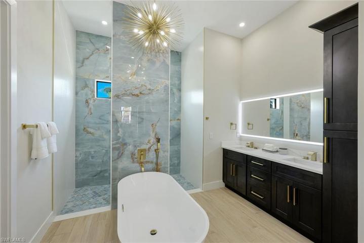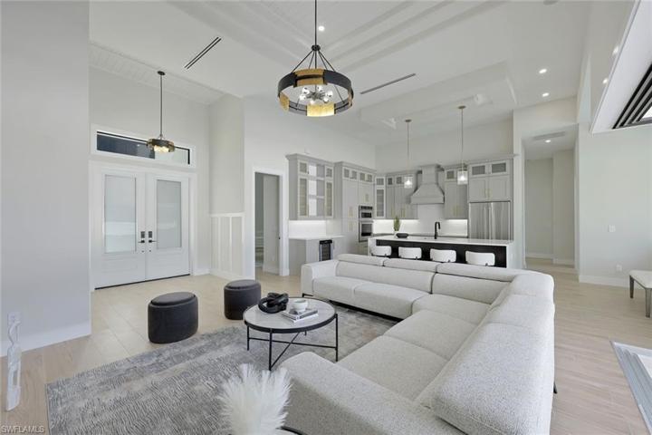 Open living space with 15′ coffered ceilings, feature wall and fireplace. 90-degree sliders will allow seamless indoor and outdoor living. The custom pool with a waterfall will add a touch of elegance and creates a relaxing atmosphere. The high-end cabinets and quartz countertops in the kitchen and bathrooms both stylish and functional. For those who love boating, this home provides easy access to the Gulf of Mexico. The completion date for this home is set for mid-2024, a similar finished model is available, allowing potential buyers to get a sense of the final product.