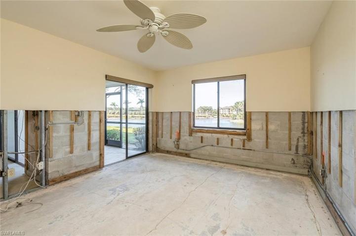 Location and Lifestyle! Unique opportunity to redo this 2 bedroom, 2 bath, first floor condo with western exposure offering spectacular sunset views across the lake and golf course. Bursting with potential and featuring an ideal floorplan and screened lanai with electric storm shutter, this unit had the sheetrock cut 4 feet up after Hurricane Ian and is ready for your vision and customization. Enjoy the Kelly Greens lifestyle including championship golf and tennis, pickle ball, pools, bocce and social events. Super convenient to all shopping, dining, fitness and airport (RSW), Ft. Myers Beach and Sanibel. Brand new roof and CAC. Great year round or part-time snowbird living or rental property. Low taxes and fees.