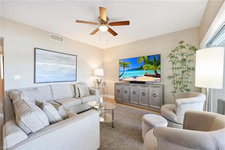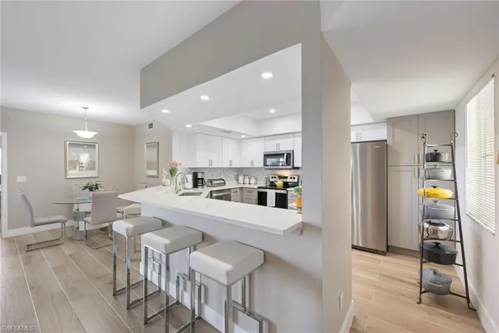 TOTALLY REMODELED – GORGEOUS – LAKEFRONT – COVERED PARKING – GROUND FLOOR. This Stunning Lakefront Condo in Lakeside is a rare opportunity that has been Completely Remodeled with exquisite detail. Featuring 2 bedrooms and 2 baths, it boasts an open-concept Custom Kitchen designed with the wall removed to create a spacious living area that maximizes breathtaking lake views. The New Kitchen has custom cabinetry with soft close drawers, Whirlpool stainless steel appliances, large deep sink, quartz countertops and a breakfast bar perfect for casual meals and enhanced with recessed lighting and a tray ceiling for added elegance. The Master Shower and Guest Bath have been totally remodeled with new tile, high profile vanities with quartz countertops, upgraded fixtures and beautiful lighting throughout. The condo has new porcelain tile flooring throughout the unit and has additional upgrades including – remote privacy shades, high baseboards for a polished look and a Dry Bar for entertaining, a huge walk-in closet for ample storage, a 2020 Water Heater, New HVAC System, Mounted TV and upgraded lighting & fans. The outdoor space has a beautiful paver deck outside the lanai, ideal for enjoying the lakefront views, a tiled entry with a large storage closet and a screened door for all your cross ventilation needs. Lakeside is a gated community with a 40-acre lake and offers many amenities, including two swimming pools, spa, and a two-story Old Florida clubhouse, complete with sauna, weight room, shower, kitchen facilities, library and game rooms. Lakeside also features five clay tennis courts, tot playground, pickle ball, shuffleboard, bocce and basketball courts. A 1.5 mile walking path meanders through an award-winning lush landscape including two lighted lake fountains. Lakeside is located close to everything – 5 minutes to Mercato, 10 minutes to Vanderbilt Beach & only 20 minutes to downtown Naples. This beautifully remodeled lakefront condo in Lakeside offers a blend of luxury, comfort, and community amenities, making it an ideal choice for those seeking a serene lifestyle with access to recreational activities. With its stunning interior features and prime location, it is both a rare find and a perfect opportunity for prospective homeowners.