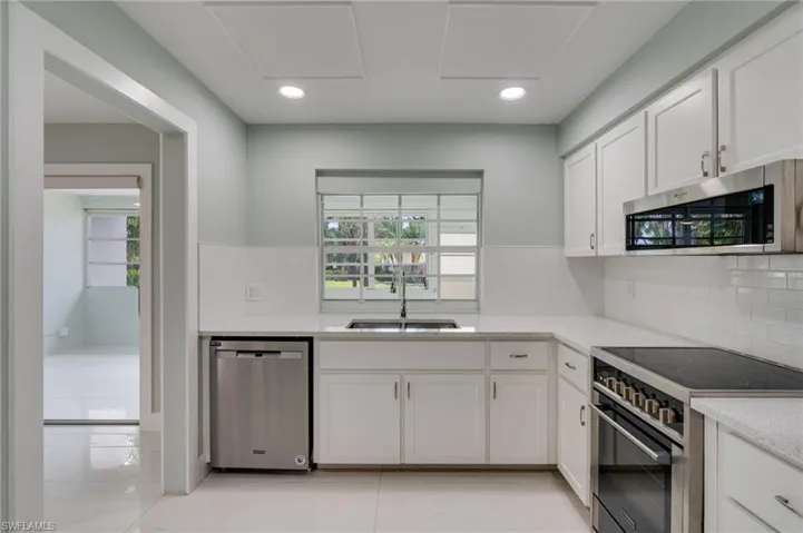 Welcome to this beautifully maintained attached villa in desirable Naples Florida — an ideal blend of relaxed coastal living and easy maintenance. Bright, open-concept living areas flow seamlessly to an enclosed Florida room, perfect for morning coffee or evening sunsets. The well-appointed kitchen features granite countertops and updated stainless appliances. The primary suite offers a tranquil retreat with an en-suite bath, spacious closet, and direct access to the Florida room. A second bedroom/den and full bath provide flexible guest or office space. Tile floors throughout the main living areas, neutral finishes, and abundant natural light give the home a fresh, move-in-ready feel.