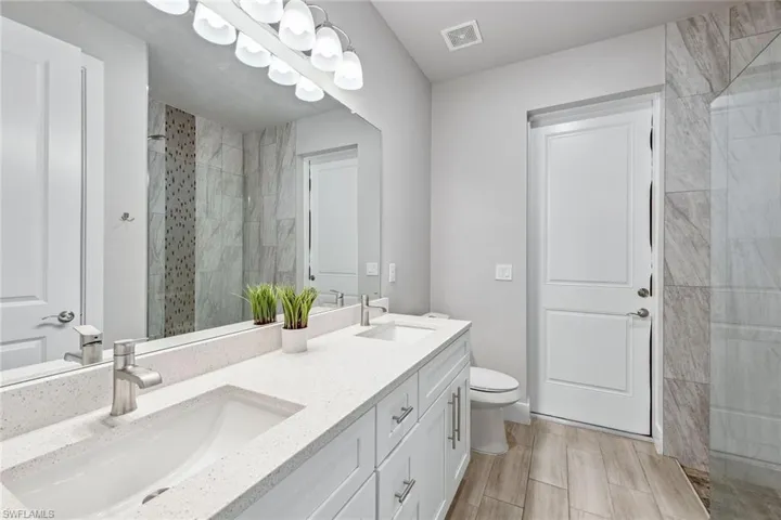 This stunning new construction home boasts an expansive 1,830 square feet of luxurious living space, featuring four bedrooms and two baths. As you enter through the stately double doors, you’re greeted by a spacious foyer adorned with a tray ceiling and elegant chandelier, seamlessly leading into a sophisticated living room. Here, a coffered ceiling with a modern fan complements the direct access to the lanai through a glass slider, blending indoor comfort with outdoor allure. The heart of this home is the kitchen, equipped with 42-inch white shaker-style cabinets with soft-close doors, quartz countertops, a stylish tile backsplash and a large center island. Stainless steel appliances and a walk-in pantry add to the functionality, while the adjacent dining room, under a tray ceiling with views of the sparkling pool, offers the ideal setting for intimate dinners and gatherings. Outdoors, the lanai invites relaxation and entertainment, featuring a Travertine deck, heated pool with sun shelf and infinity-edge spa, complemented by an outdoor kitchen with a built-in gas grill. Enjoy the ease of a pool bath, outdoor speakers and a fan for those warm Florida days. The owner’s suite is a private retreat with two walk-in closets, a tray ceiling, and an en-suite bath showcasing a dual sink white vanity and an oversized rainfall walk-in shower with a frameless glass enclosure. Additional luxuries include wood-like porcelain tile floors, 8-foot doors, in-ceiling speakers, upgraded lighting throughout, a laundry room with LG appliances, and smart home features such as WiFi pool automation, video security and a Nest thermostat. The exterior is just as impressive, with a brick paver driveway, landscape lighting, and a completely fenced yard ensuring privacy and security. Experience unparalleled elegance and comfort in this meticulously designed home, where every detail caters to a sophisticated and luxurious lifestyle.
