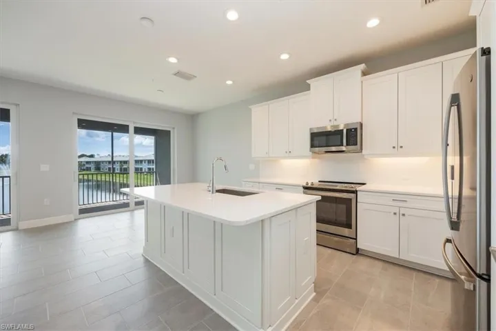 One or more photo(s) has been virtually staged, AI generated or rendered. Minutes to downtown and the fabulous Gulf beaches! Gated community! Spectacular long lake and fountain view with Western exposure! Never Lived in! Bright and Spacious great room plan with 3 bedrooms, 2 baths and large lanai overlooking the lake and fountain. Split bedroom plan with excellent closet space. Island kitchen open to the great room with a wall of sliders to the lanai. Enjoy a double garage and laundry room with storage, beautiful quartz counter-tops, tiled living area and carpeted bedrooms. Clubhouse with a gathering area & kitchen, pool, hot tub and exercise room.