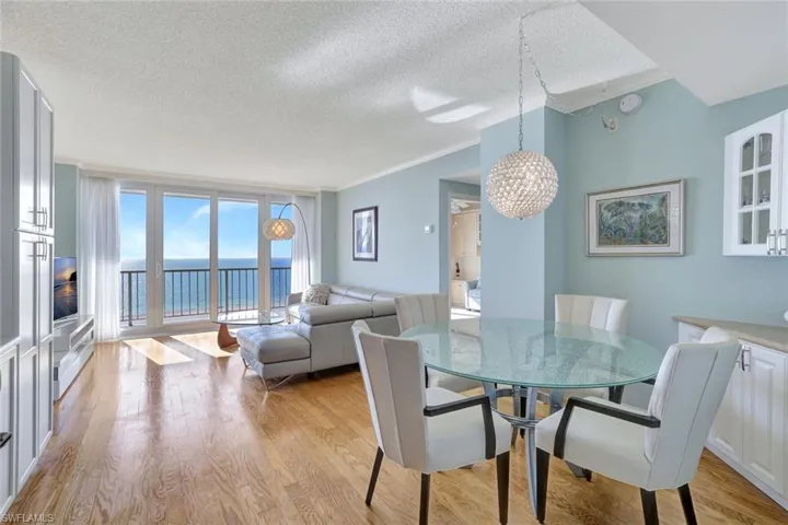 Inside, the home is light, bright, and beautifully finished with wood flooring and coastal-inspired décor. Impact sliding doors frame the shimmering Gulf of Mexico, offering breathtaking views from both the master and guest bedrooms as well as the spacious living room. Built-in cabinetry adds style and functionality, while the long private balcony provides an incredible outdoor retreat to relax, entertain, and watch the sun melt into the horizon each evening.