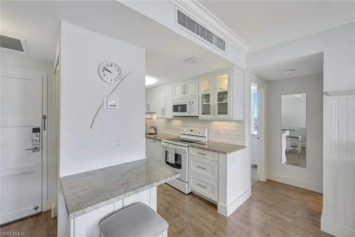 This impeccably updated condominium offers breathtaking gulf and island views with a desirable sunny western exposure with windows on all four sides, offering wonderful natural light and cross breeze. The open-concept living areas feature light wood-look tile, while the bedrooms are outfitted with plush carpeting. The kitchen has been beautifully renovated with white shaker cabinetry, a chic dimensional white subway tile backsplash, quartz countertops, and a decorative shiplap accent wall as well as a built-in desk area. The updated primary bath is equally impressive with white cabinetry and quartz countertops. The guest bath boasts a pedestal sink, stylish shiplap wall treatment and solid tiled accents. Offered fully furnished, this exceptional unit underwent a complete renovation in 2013, with additional updates including a new water heater and air-conditioning system in 2021, new dishwasher and new mattresses in 2024. The building itself has been beautifully managed and renovated, offering one of the largest pools on the island. Admiralty House is designed with only six units per floor, ensuring a more intimate and private living experience. A milestone engineering inspection was completed in November 2022, with no structural issues found. Additional amenities include a secured building, tennis courts, a car wash area, covered parking, a barbecue by the pool, extra storage and a social room. Cable TV and Wi-Fi are included in the condominium fee, and the building boasts a robust reserve fund of over $2 million.