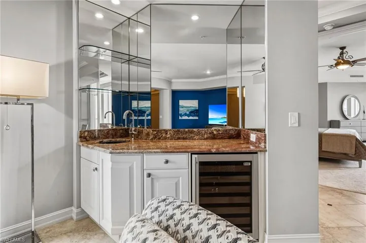 A private elevator—one of three servicing the residence—opens to a gracious foyer and an expansive open-concept floor plan designed for sophisticated living and entertaining. The gourmet kitchen is a culinary showpiece, appointed with granite countertops, a tumbled marble backsplash, custom lighting, and premium appliances including a KitchenAid dishwasher, GE Advantium Speed oven, GE convection oven, warming drawer, and a built-in KitchenAid French door refrigerator. A full wet bar with wine cooler seamlessly enhances the living and dining areas.