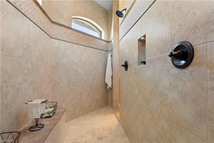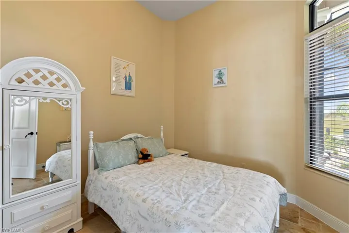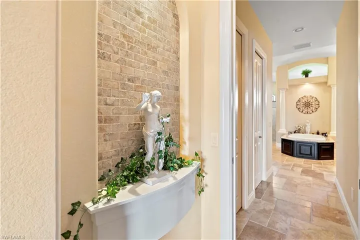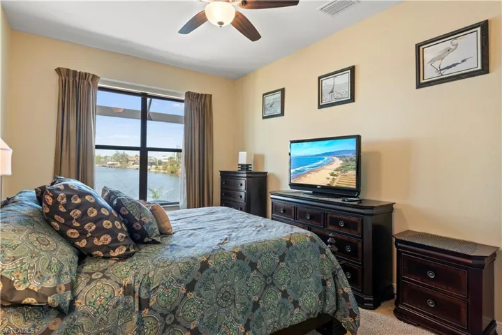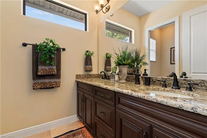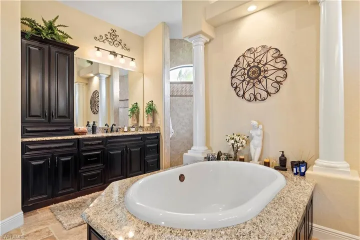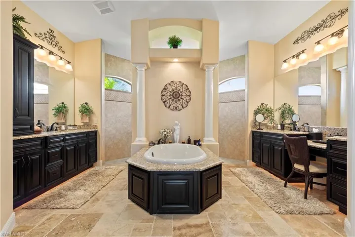access to the lanai and water views. The master bathroom centers around a decked tub with a