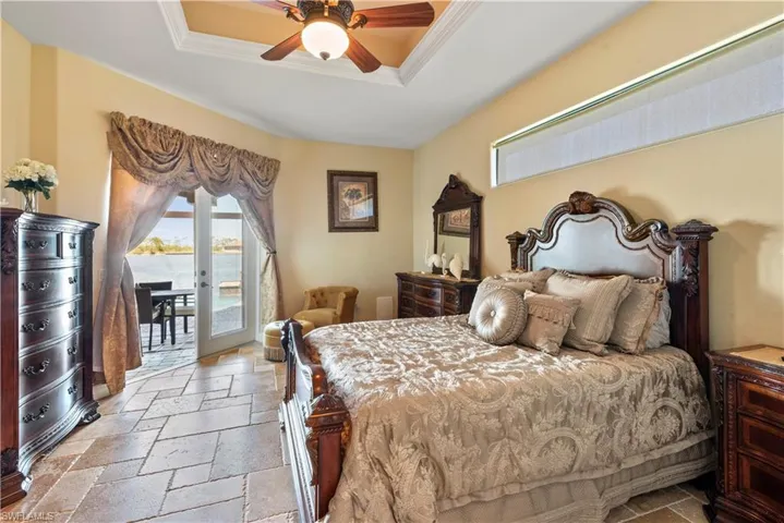 bedroom rests beneath a tray ceiling with soft recessed lighting and has french doors for private