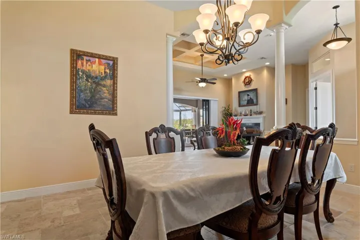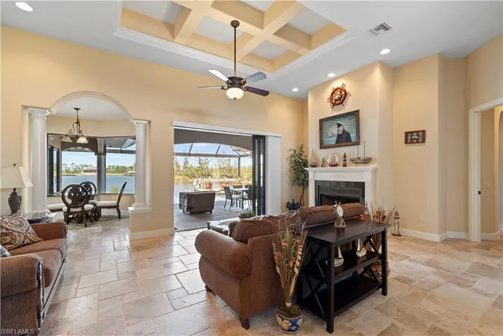 fireplace beneath a coffered ceiling. The primary suite spans the length of the home, the
