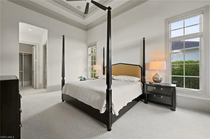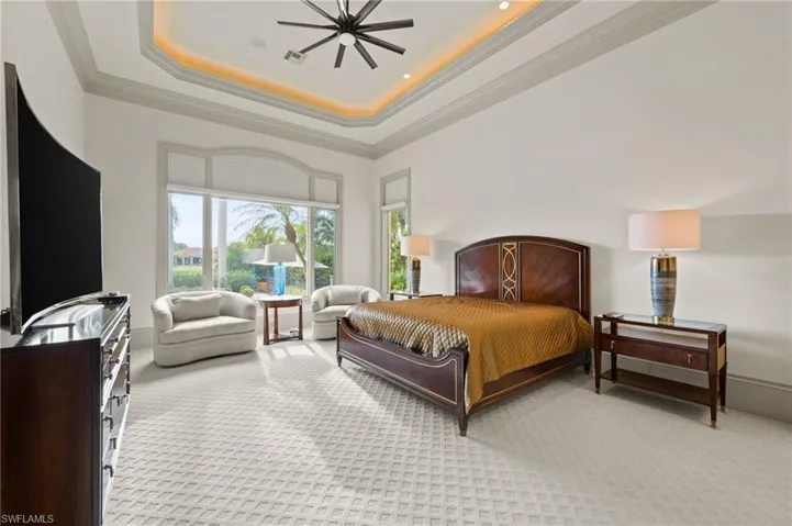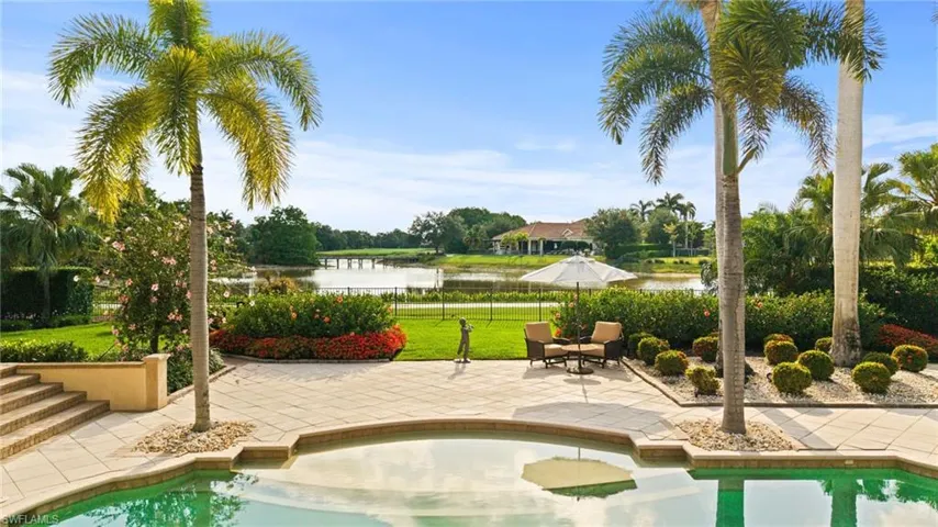 TRANSFERABLE GOLF MEMBERSHIP AVAILABLE! Skip the waitlist and pay only a transfer fee! Ideally situated in the prestigious community of Quail West, this impressive residence offers a thoughtful floor plan complemented by expansive outdoor living spaces including a screened lanai and spectacular golf and sunset views. The luxurious primary suite is uniquely designed with dual en suite bathrooms connected by a shared sitting area creating a tranquil retreat of privacy and comfort. Three additional guest suites offer plenty of space for visitors too. Perfect for entertaining, the open-concept great room flows seamlessly into the chef-inspired kitchen, which features an oversized island, breakfast bar, dual prep sinks, and a walk-in butler’s pantry complete with a beverage refrigerator. From terrazzo flooring and tray ceilings to a cozy fireplace and dramatic floor-to-ceiling windows, every detail of this home speaks of refined elegance. The screened lanai includes a covered seating area with an outdoor kitchen, and the custom pool—with integrated spa and sun shelf—is strategically positioned to maximize sun throughout the day. The spacious three-car garage provides ample room for vehicles, a golf cart, and all your Florida lifestyle essentials.