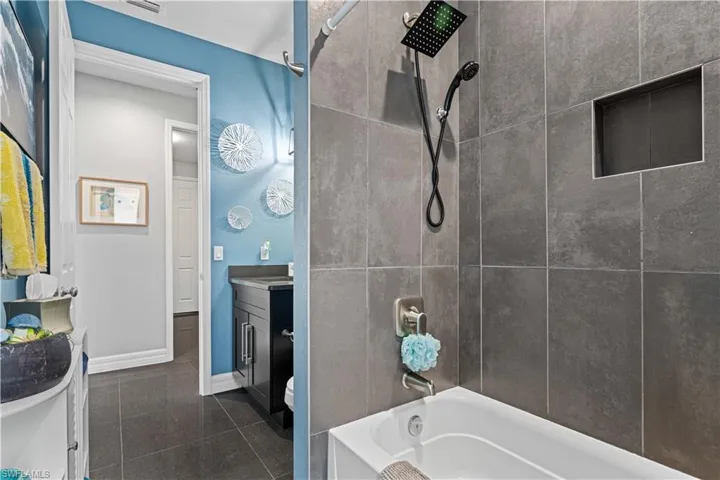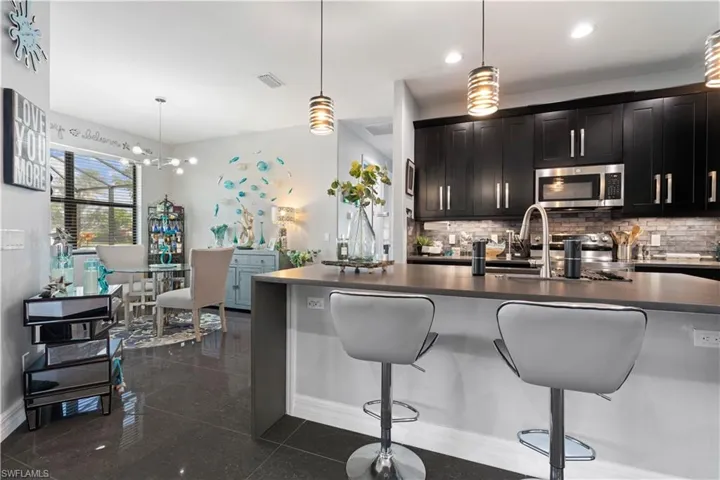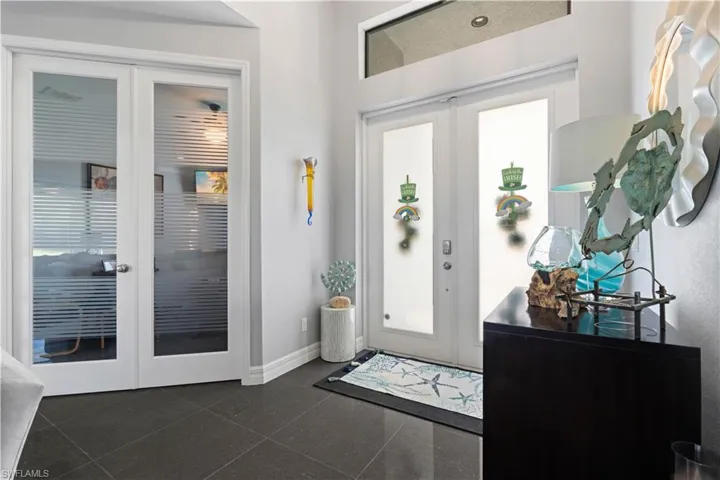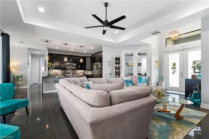 WATERFRONT POOL HOME JUST OFF LAKE WEATHERLY – Positioned in the heart of Cape Coral between Skyline Blvd and Santa Barbara Blvd, this 2022-built, 3 bed/2 bath + den home on a freshwater canal combines modern design with an unbeatable in-town location. Close to shopping, dining, and parks, the setting offers both convenience and waterfront appeal, all with no HOA. Eastern rear exposure fills the lanai and pool with soft morning sun while keeping afternoons comfortable. The in-ground pool features a sun shelf and expansive brick paver deck surrounded by a screened pool enclosure. The lanai boasts a retractable Kevlar screen for added hurricane protection. Freshwater canal behind the home provides wide water views and direct access to Lake Weatherly for kayaking, paddleboarding, and relaxing afternoons on the water. Inside, soaring ceilings and polished 24×24 granite tile flooring create a sleek, cohesive look throughout. An open-concept layout maximizes natural light and frames the pool and canal through large sliding glass doors, blending indoor and outdoor living effortlessly. The kitchen makes a strong statement with a waterfall island and breakfast bar seating, modern dark cabinetry, stainless steel appliances, glass tile backsplash, and abundant prep space. Designed for both entertaining and everyday life, it flows seamlessly into the dining area and great room. The split-bedroom design ensures privacy. The primary suite offers generous proportions and a spa-inspired bath with dual sinks, a freestanding soaking tub, and a separate walk-in shower with dramatic tile detail. Two guest bedrooms share a full bath (that doubles as a pool bath w/access to the lanai), while the den provides flexibility as a home office, media room, or optional fourth bedroom, if needed. Impact windows, city water and sewer, a paver driveway, and a spacious 3-car attached garage complete the package. Modern construction, freshwater frontage, and a central Cape Coral location come together in one compelling opportunity. Schedule your showing today and start enjoying waterfront living with space, style, and convenience.