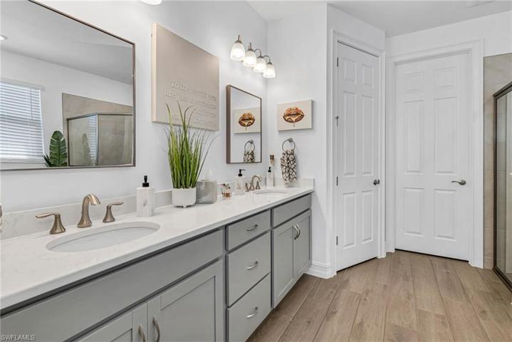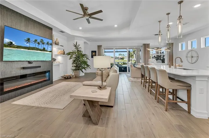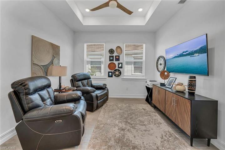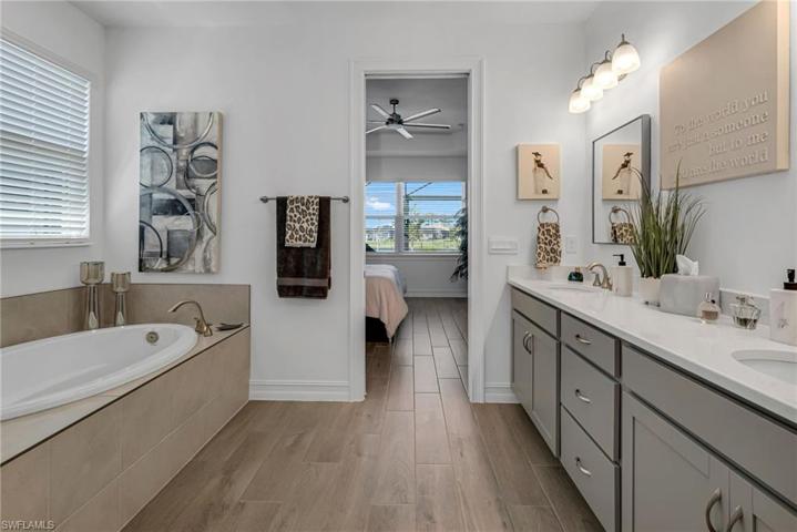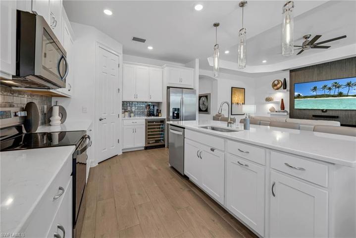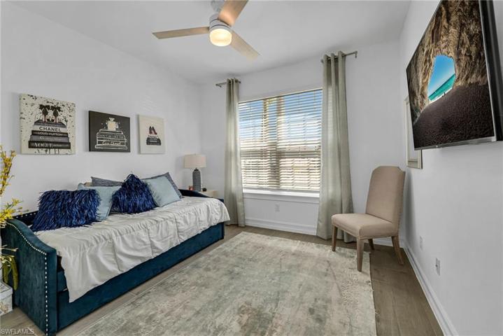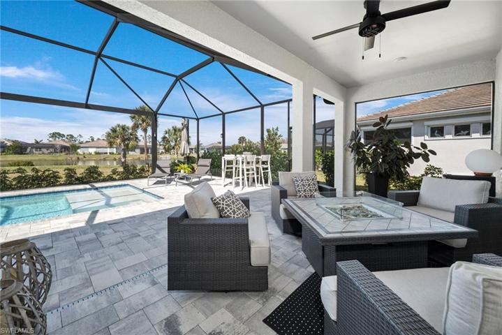 Upon entering this exquisitely furnished residence, you will be amazed by the spacious, open flow. Situated in one of Bonita Springs’ newest communities, this home offers ample room to entertain family and friends in a light, bright space. The family room boasts a gorgeous feature wall with floating shelves and a fire feature, perfect for a cozy evening indoors. The kitchen is a joy to cook in with an abundance of cabinets and countertop space. An oversized island, perfect for entertaining and family gatherings, with seating up to four! The guest rooms provide privacy and comfort for your visitors. Relax on your enormous lanai overlooking the sparkling pool and lake. Community amenities include a resort-style pool, a beach area with lounge chairs and tables, a gazebo, fitness center, tennis, bocce ball, and yes – pickleball. There are two separate dog parks, one for large and one for small dogs. Located minutes from I-75 and centrally located between Naples and Ft. Myers, this home is the perfect Florida residence.