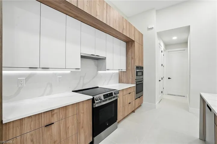 Step inside through the double front doors with glass inserts and you’ll find over 2,200 square feet of living space with a total of more than 3,200 under roof. The main living areas feature twelve-foot tray ceilings and large-format tile throughout, giving the home a bright and open feel. The kitchen is a showpiece with two ovens, upgraded GE appliances, custom wood cabinetry, quartz countertops with waterfall edges, a full backsplash, and an oversized island with a workstation sink, pop-up outlets, and plenty of seating areas. A custom pantry with shelving, a built-in bar with wine cooler, and a dining area with a wine rack make the space as functional as it is stylish.