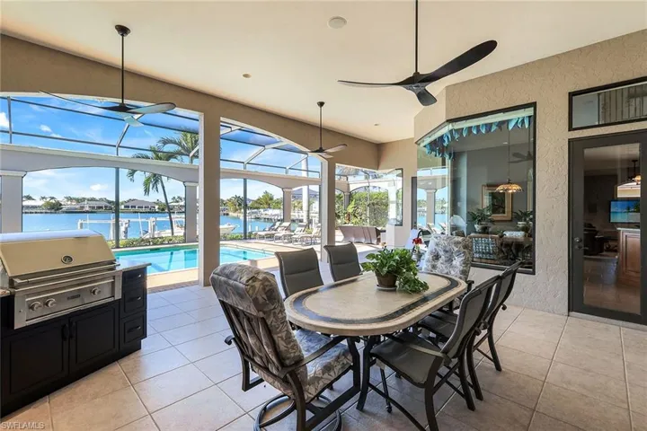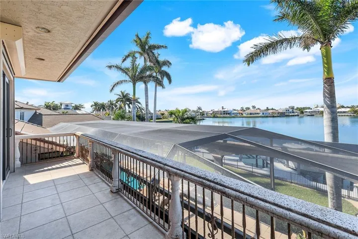 This exceptional custom-built home is on an oversized lot with stunning wide water views of Fredericks Bay. Deep water quick direct access out to the Gulf of Mexico through Caxambas Pass. This spacious two-story, five-bedroom plus den, 4.5-bath residence has everything you need with a formal living area, wine room and wet bar, updated gourmet kitchen with breakfast area, new appliances, beautiful cabinets, and adjacent warm and welcoming family room that can be used as additional dining area. The fifth bedroom comes with custom-built-ins which can also be used as an office/art studio. Enjoy the morning sunrise from the outdoor coffee patio or captivating sunsets from your expansive outdoor veranda with pool, spa and summer kitchen. The primary suite retreat offers dual sinks, bidet, with separate tub and shower. The second floor offers privacy for guests with a second primary bedroom and private balcony to enjoy stunning bay views. This home has an abundance of storage that includes walk-in closets in every bedroom. A large composite dock with a 16,000-pound and a 6,000-pound lift provides the ideal opportunity for the boater enthusiast and includes your own air-conditioned dock storage. Impact glass, manual and electric shutters, over-sized three-car garage and circular driveway. Surrounded by lush tropical landscaping. Make this your slice of paradise today!