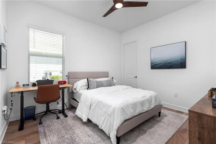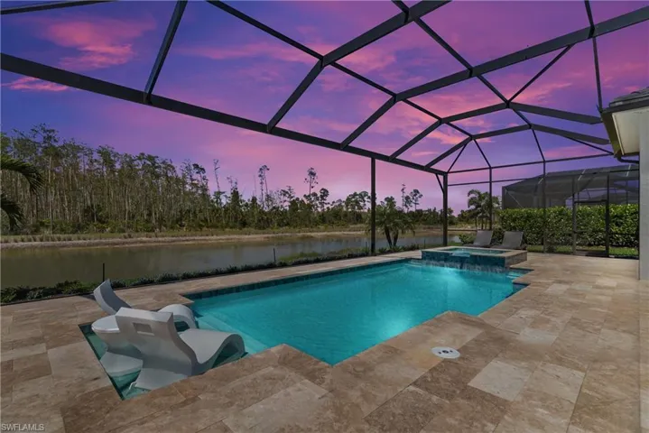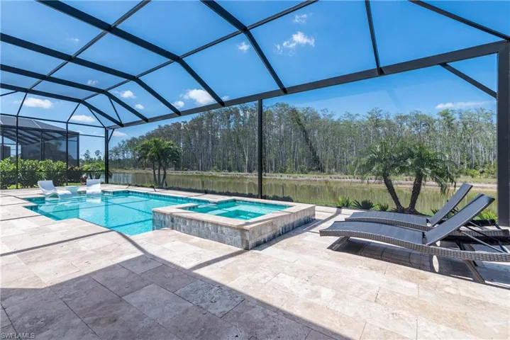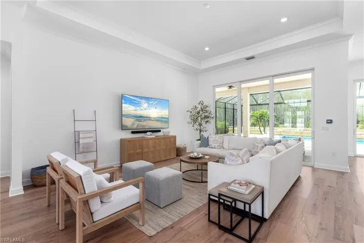 This spacious single-level home offers a modern open-concept plan among the bright Great Room, dining room and kitchen that opens to the lanai for seamless indoor-outdoor living. The owner’s suite enjoys one side of the home, while three secondary bedrooms are found on the other side. Located in WildBlue, a one-of-a-kind master-planned community that spans 3,067 beautiful acres nestled just north of Naples and south of Ft. Myers, Florida offers 800 acres of water and 1000 acres of preserve. This Iris Model has 4 bedrooms, 3 full baths, almost 3000 Square feet under air, and a massive lanai with pool/spa and outdoor kitchen. The interior of the home features wood flooring in the main living area and bedrooms, white kitchen with quartz countertops and backsplash and GE Profile appliances. The interior of the home has 12 foot volume ceilings, tray ceilings of 13 feet, and 10 foot impact resistant sliders . The bedrooms have 10 foot ceilings with solid wood doors. The Club at Wildblue has resort clubhouse with cabana bar at pool, Clubhouse dining/bar under air, marina, pickelball, tennis, lap pool, staffed fitness center, spin room, yoga, day spa, dry sauna, bocce court, basketball court, concert lawn and more. Only 15 minutes to RSW!